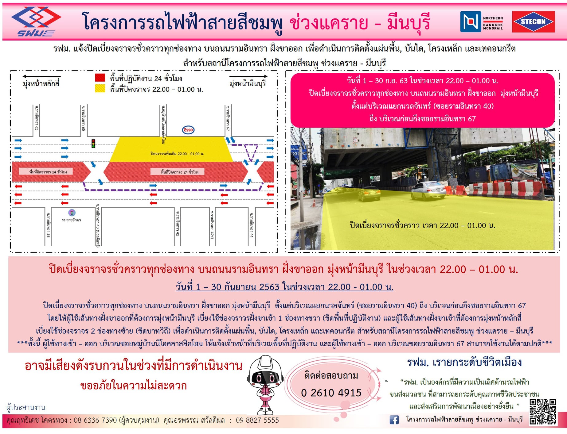 ปิดเบี่ยงจราจรชั่วคราวทุกช่องทาง บนถนนรามอินทรา ฝั่งขาเข้าและฝั่งขาออก ตั้งแต่บริเวณแยกนวลจันทร์ (ซอยรามอินทรา 40) ถึง บริเวณก่อนถึงซอยรามอินทรา 67 เพื่อดำเนินการติดตั้งแผ่นพื้น, บันได, โครงเหล็ก และเทคอนกรีต วันที่ 1 – 30 กันยายน 2563 เวลา 22.00 – 04.00 น.