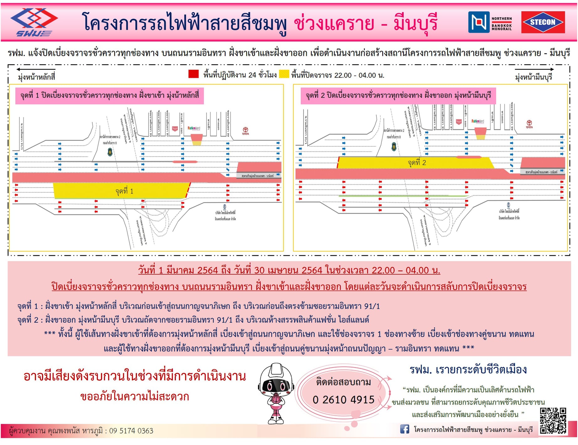 ปิดเบี่ยงจราจรชั่วคราวทุกช่องทาง บนถนนรามอินทรา ฝั่งขาเข้าและฝั่งขาออก บริเวณแยกนวลจันทร์ (ซอยรามอินทรา 40) ถึง บริเวณหมู่บ้านเสนาพาร์ค และ บริเวณซอยรามอินทรา 113 ถึง บริเวณซอยรามอินทรา 123 วันที่ 4 มกราคม 2564 ถึง วันที่ 31 มีนาคม 2564 เวลา 22.00 – 05.00 น.