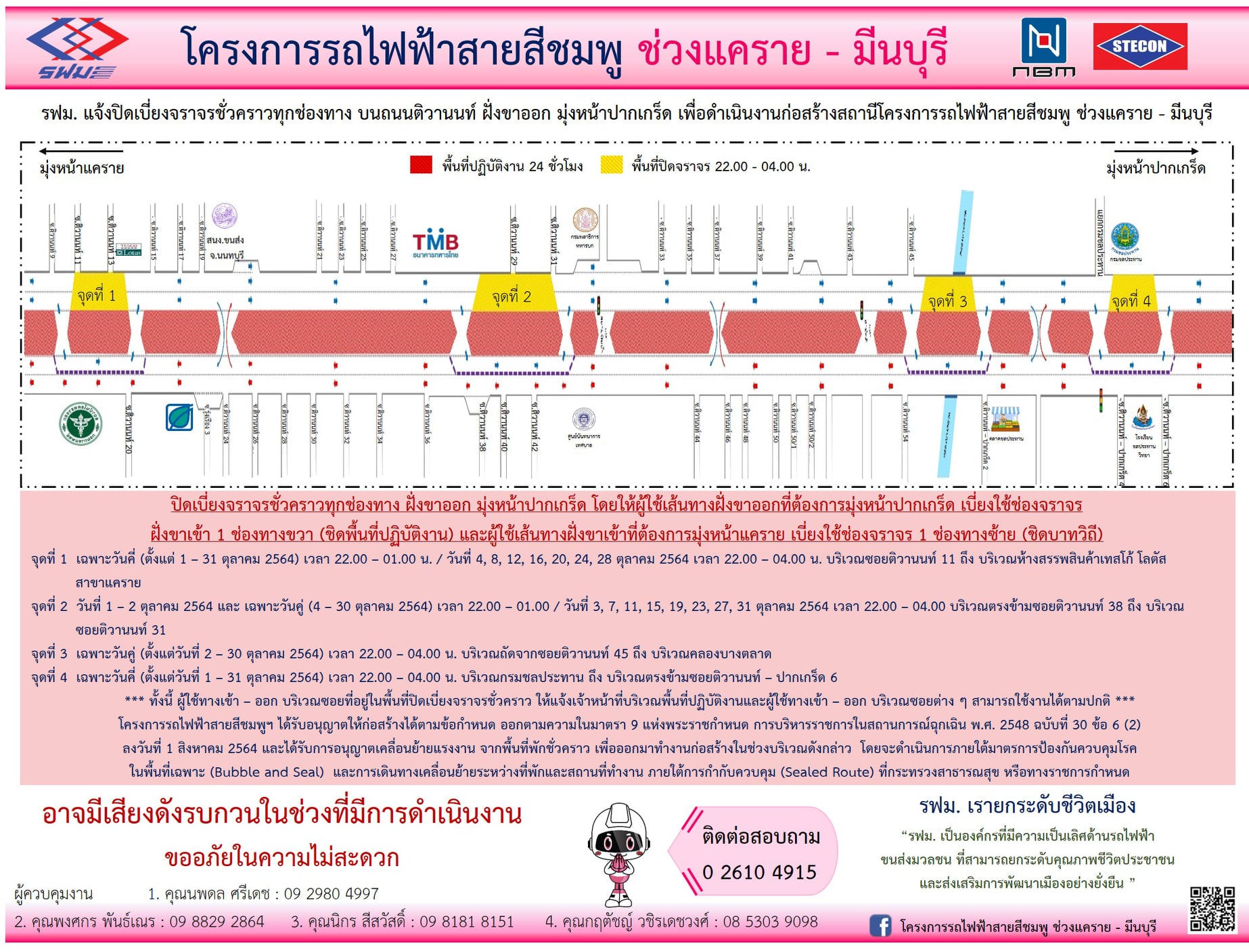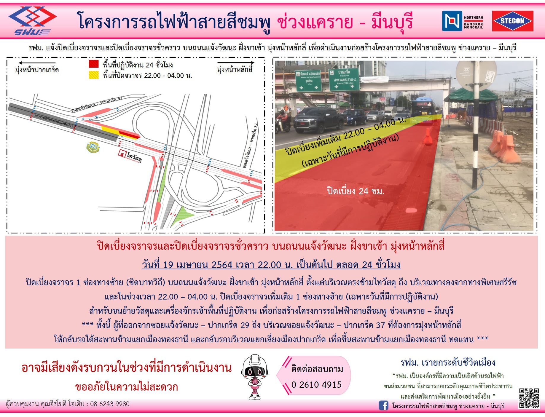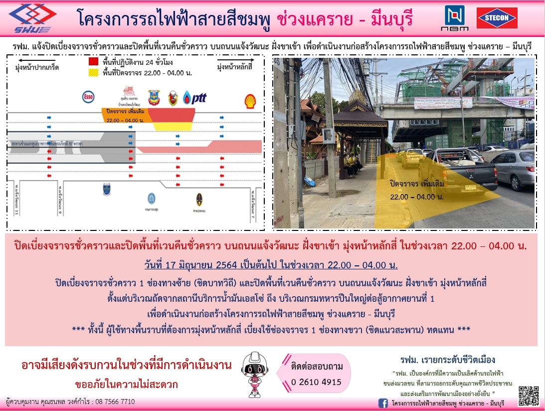 ปิดเบี่ยงจราจรชั่วคราวทุกช่องทาง บนถนนแจ้งวัฒนะและบนถนนรามอินทรา ฝั่งขาเข้าและฝั่งขาออก บริเวณมหาวิทยาลัยราชภัฏพระนคร ถึง บริเวณสะพานข้ามคลองถนน และ บริเวณก่อนเข้าสู่ถนนกาญจนาภิเษก ถึง บริเวณก่อนถึงตรงข้ามซอยรามอินทรา 91/1 เพื่อดำเนินงานก่อสร้างสถานี วันที่ 1 – 31 ตุลาคม 2563 ในช่วงเวลา 22.00 – 04.00 น.