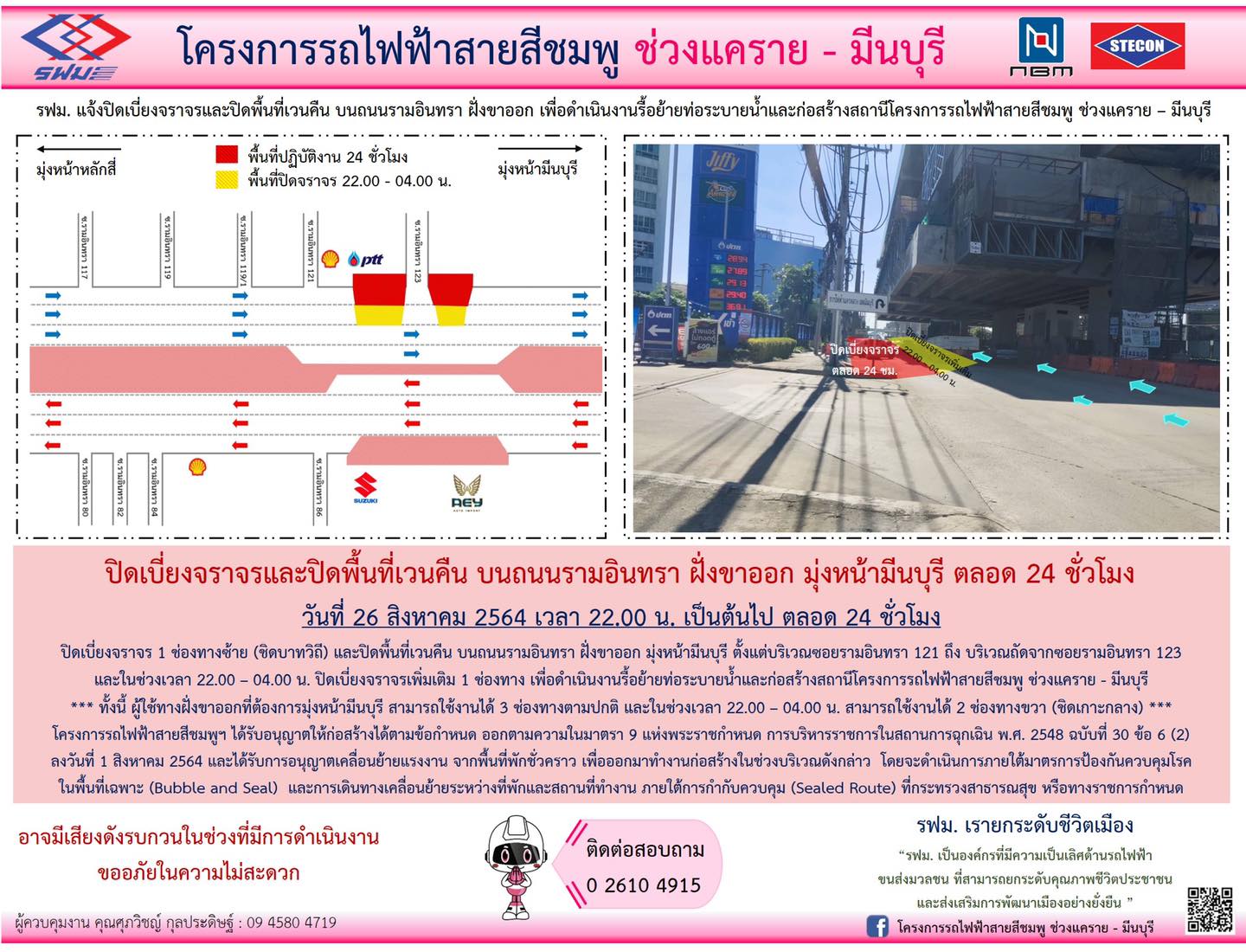 ปิดเบี่ยงจราจรและปิดพื้นที่เวนคืน บนถนนรามอินทรา ฝั่งขาออก มุ่งหน้ามีนบุรี บริเวณซอยรามอินทรา 121 ถึง บริเวณถัดจากซอยรามอินทรา 123 วันที่ 26 สิงหาคม 2564 เวลา 22.00 น. เป็นต้นไป ตลอด 24 ชั่วโมง เพื่อดำเนินงานรื้อย้ายท่อระบายน้ำและก่อสร้างสถานี