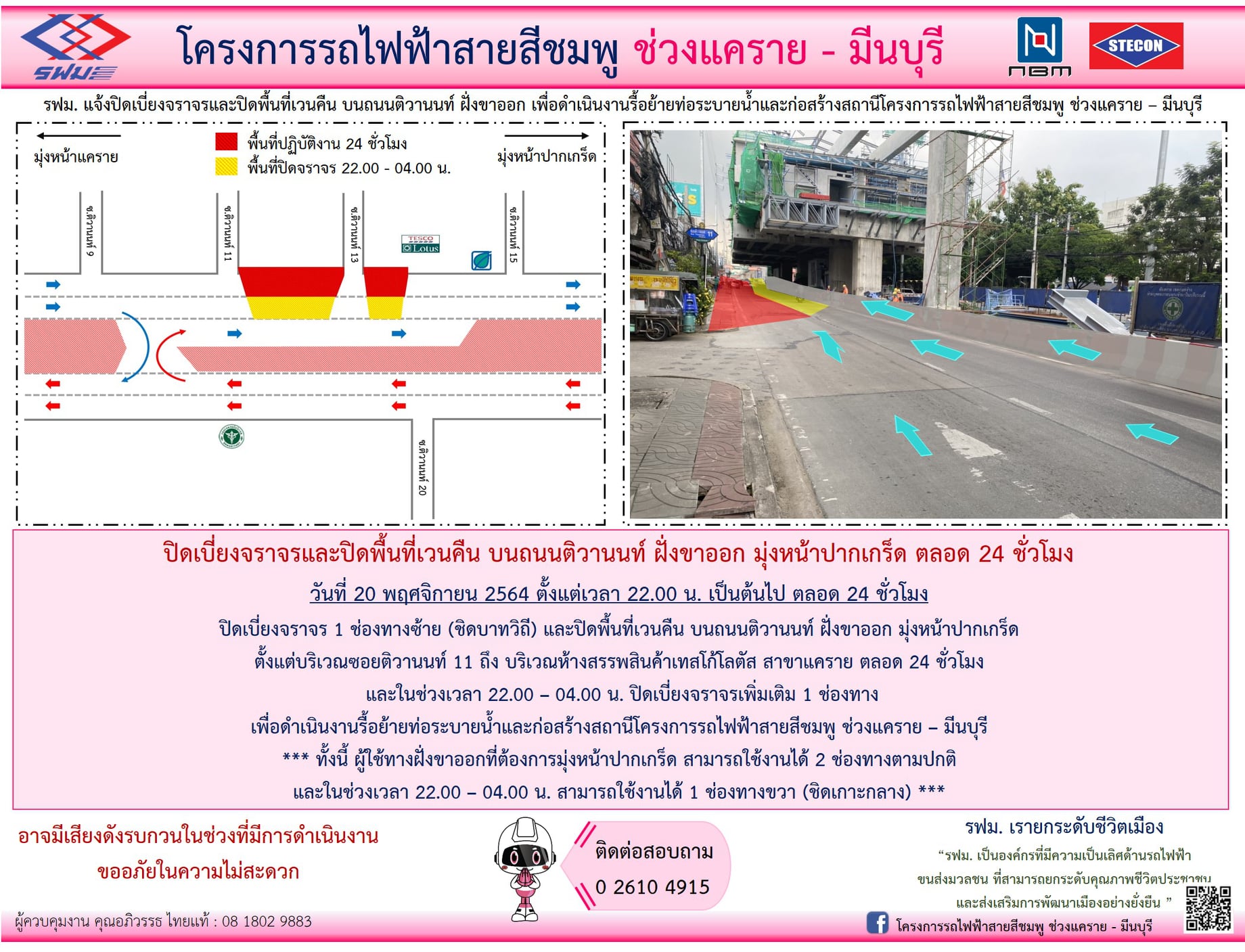 ปิดเบี่ยงจราจรและปิดพื้นที่เวนคืน บนถนนติวานนท์ ฝั่งขาออก มุ่งหน้าปากเกร็ด บริเวณซอยติวานนท์ 11 ถึง บริเวณห้างสรรพสินค้าเทสโก้โลตัส สาขาแคราย วันที่ 20 พฤศจิกายน 2564 ตั้งแต่เวลา 22.00 น. เป็นต้นไป ตลอด 24 ชั่วโมง เพื่อดำเนินงานรื้อย้ายท่อระบายน้ำและก่อสร้างสถานี