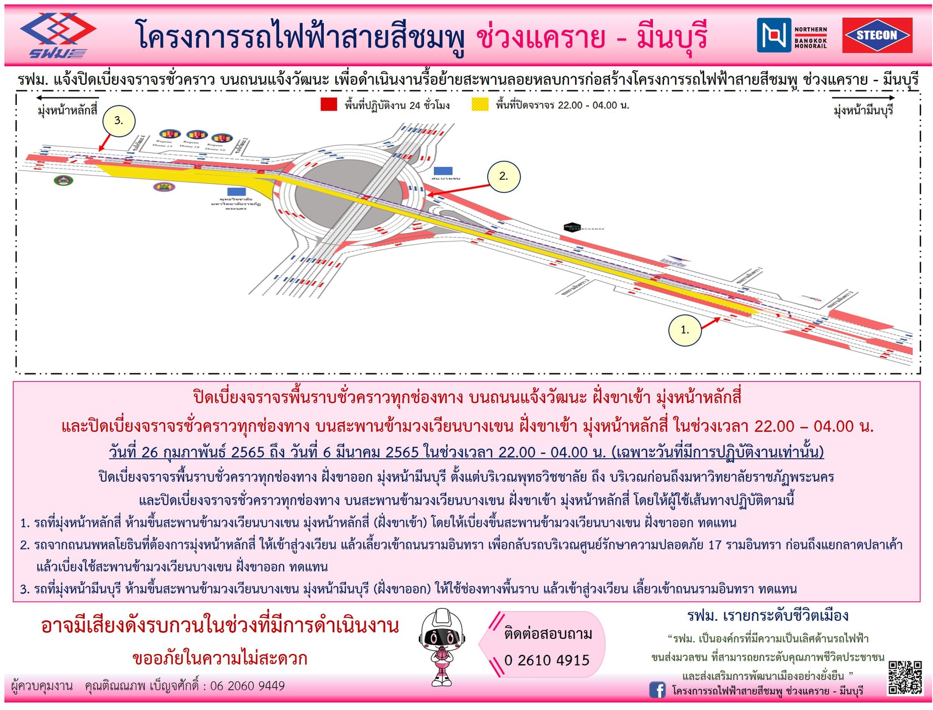 ปิดเบี่ยงจราจรชั่วคราวทุกช่องทาง บนถนนแจ้งวัฒนะ ฝั่งขาเข้าและฝั่งขาออก และบนสะพานข้ามวงเวียนบางเขน ฝั่งขาเข้าและฝั่งขาออก เพื่อดำเนินงานรื้อย้ายสะพานลอย