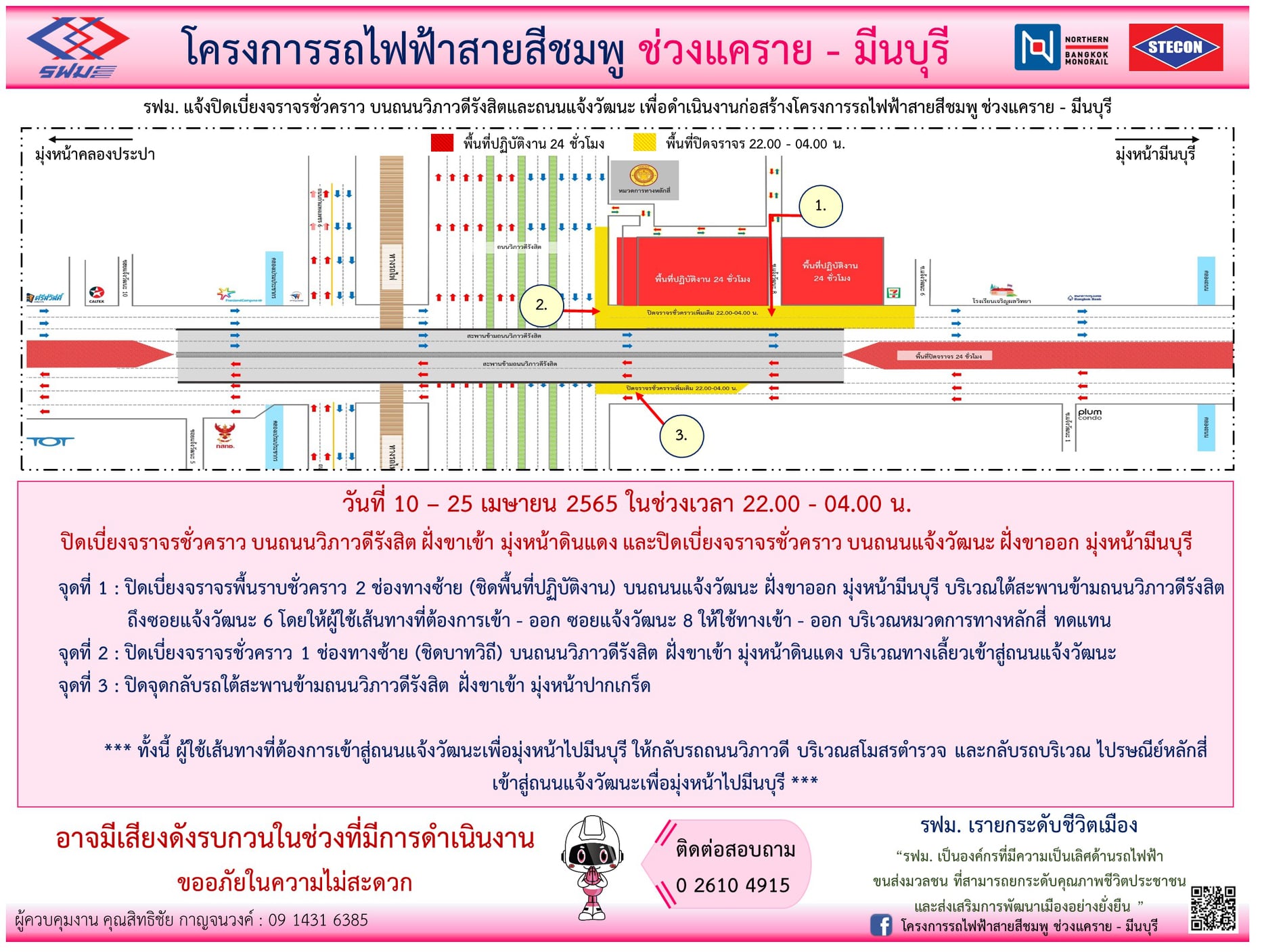ปิดเบี่ยงจราจรชั่วคราว บนถนนวิภาวดีรังสิต ฝั่งขาเข้า มุ่งหน้าดินแดง และปิดเบี่ยงจราจรชั่วคราว บนถนนแจ้งวัฒนะ ฝั่งขาออก มุ่งหน้ามีนบุรี วันที่ 10 – 20 เมษายน 2565 เวลา 22.00 – 04.00 น. เพื่อดำเนินงานก่อสร้าง