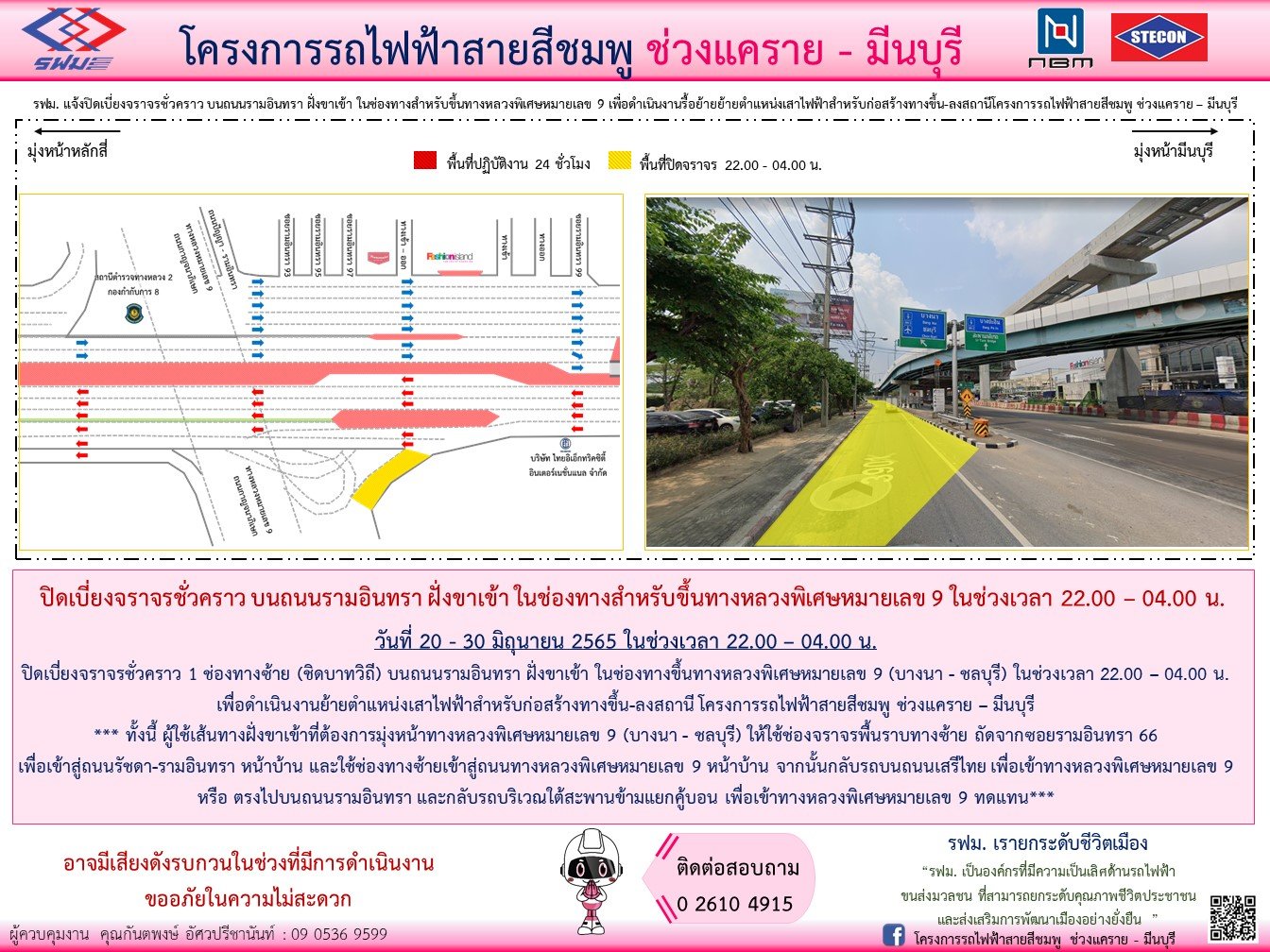 ปิดเบี่ยงจราจรชั่วคราว บนถนนรามอินทรา ฝั่งขาเข้า ในช่องทางสำหรับขึ้นทางหลวงพิเศษหมายเลข 9 วันที่ 20 – 30 มิถุนายน 2565 เวลา 22.00 – 04.00 น. เพื่อดำเนินงานย้ายตำแหน่งเสาไฟฟ้าสำหรับก่อสร้างทางขึ้น – ลงสถานี