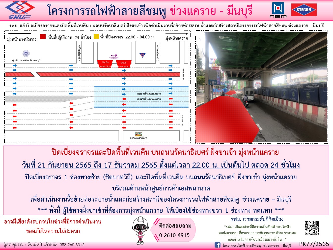 ปิดเบี่ยงจราจร 1 ช่องทางซ้าย (ชิดบาทวิถี) และปิดพื้นที่เวนคืน บนถนนรัตนาธิเบศร์ ฝั่งขาเข้า มุ่งหน้าแคราย บริเวณด้านหน้าศูนย์การค้าเอสพลานาด วันที่ 21 กันยายน 2565 ถึง วันที่ 17 ธันวาคม 2565 เป็นต้นไป ตลอด 24 ชั่วโมง เพื่อดำเนินงานรื้อย้ายท่อระบายน้ำและก่อสร้างสถานี