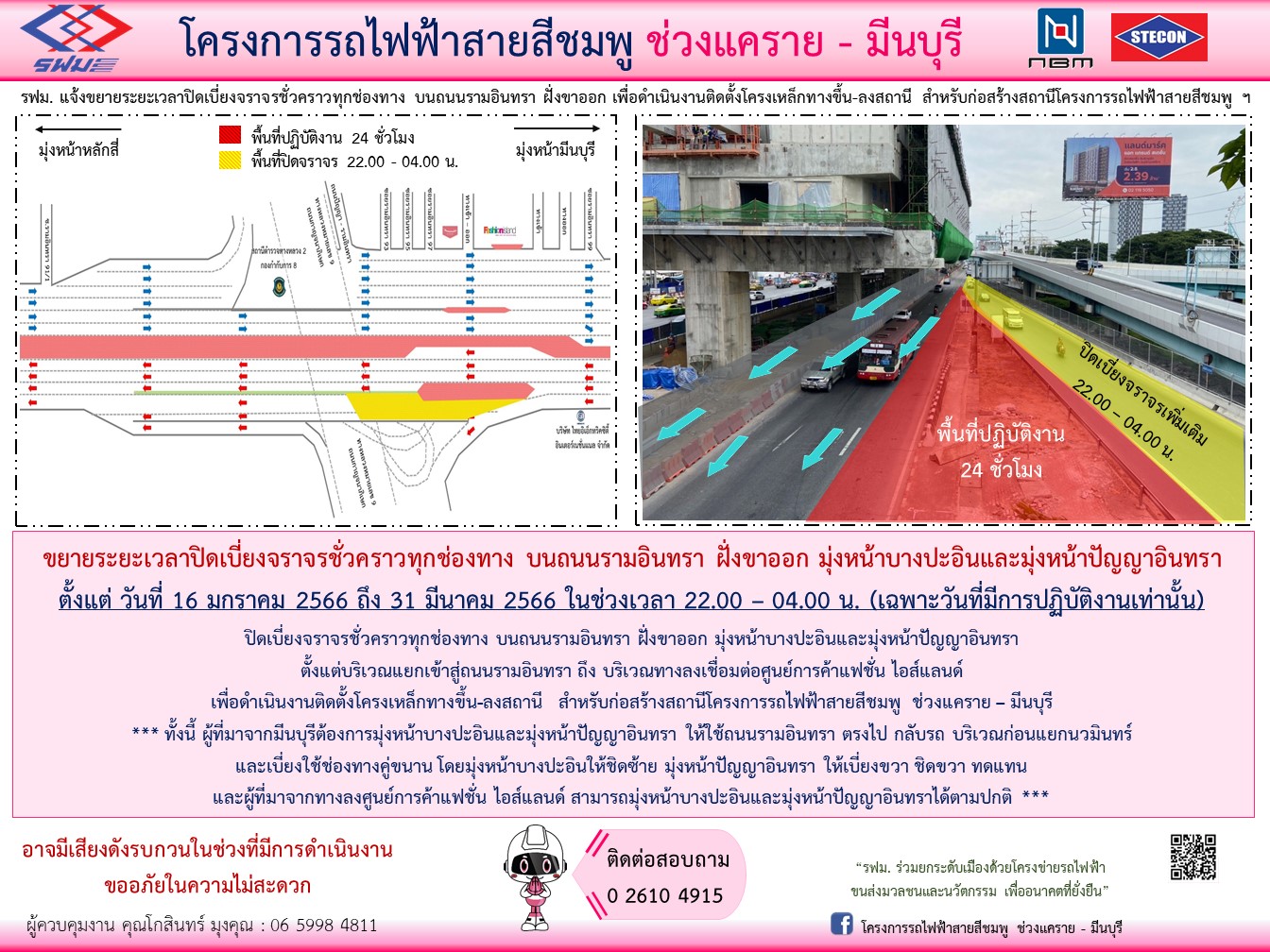 แจ้งขยายระยะเวลาปิดเบี่ยงจราจรชั่วคราวทุกช่องทาง บนถนนรามอินทรา ฝั่งขาออก มุ่งหน้าบางปะอินและมุ่งหน้าปัญญาอินทรา บริเวณแยกเข้าสู่ถนนรามอินทรา ถึง บริเวณทางลงเชื่อมต่อศูนย์การค้าแฟชั่น ไอส์แลนด์ ตั้งแต่ วันที่ 16 มกราคม 2566 ถึง 31 มีนาคม 2566 ในช่วงเวลา 22.00 – 04.00 น.