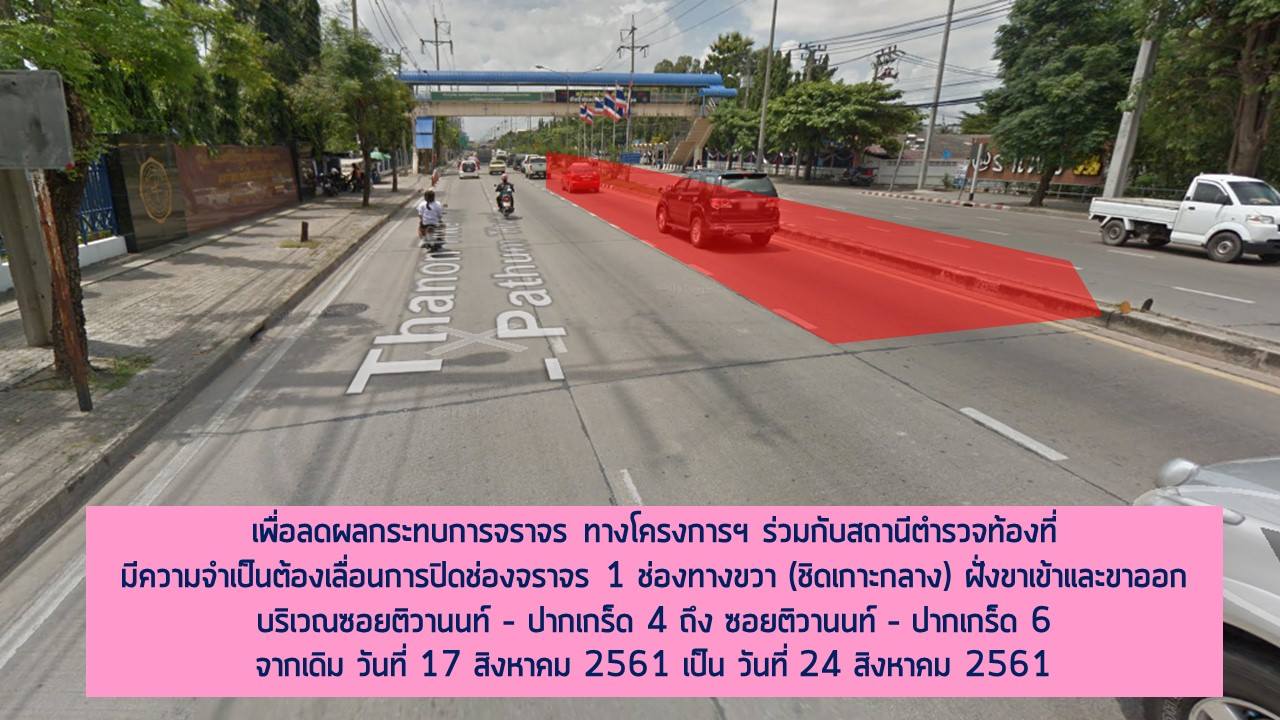 เลื่อนการปิดช่องจราจร 1 ช่องทางขวา (ชิดเกาะกลาง) ฝั่งขาเข้าและขาออก บนถนนติวานนท์ บริเวณซอยติวานนท์ – ปากเกร็ด 4 ถึง ซอยติวานนท์ – ปากเกร็ด 6