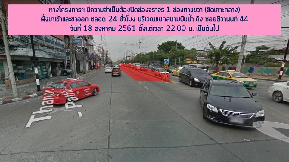 ปิดช่องจราจร 1 ช่องทางขวา (ชิดเกาะกลาง) ฝั่งขาเข้าและขาออก ตลอด 24 ชั่วโมง บนถนนติวานนท์ บริเวณแยกสนามบินน้ำ ถึง ซอยติวานนท์ 44