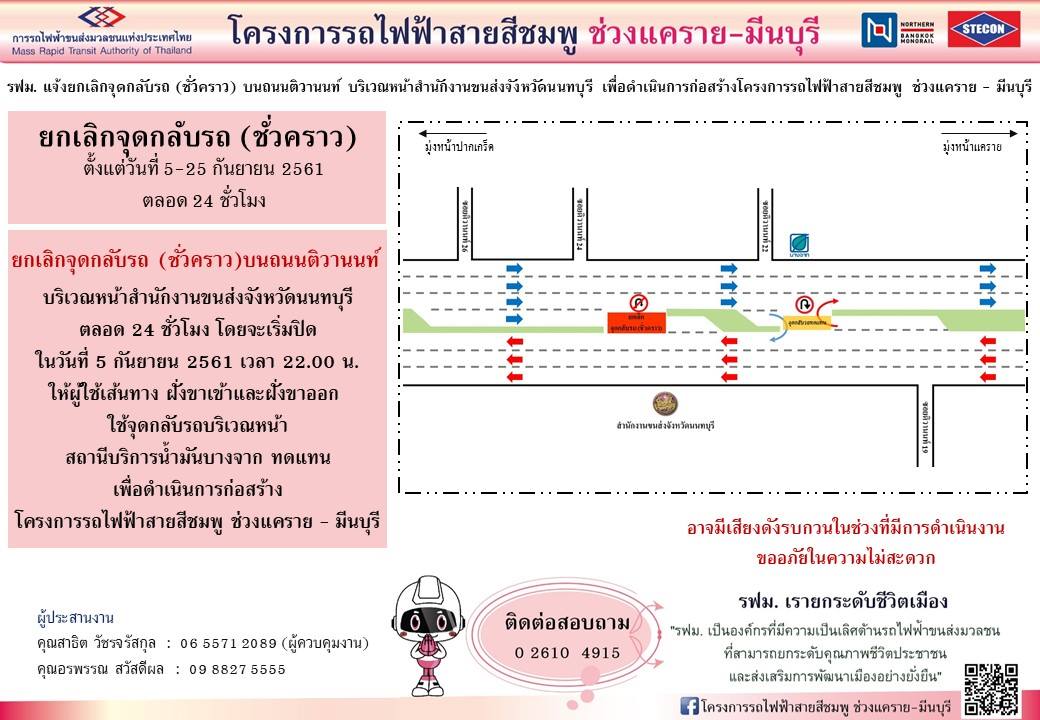 รฟม. แจ้งยกเลิกจุดกลับรถ (ชั่วคราว) บนถนนติวานนท์ บริเวณหน้าสำนักงานขนส่งจังหวัดนนทบุรี เพื่อดำเนินการก่อสร้างโครงการรถไฟฟ้าสายสีชมพู ช่วงแคราย – มีนบุรี
