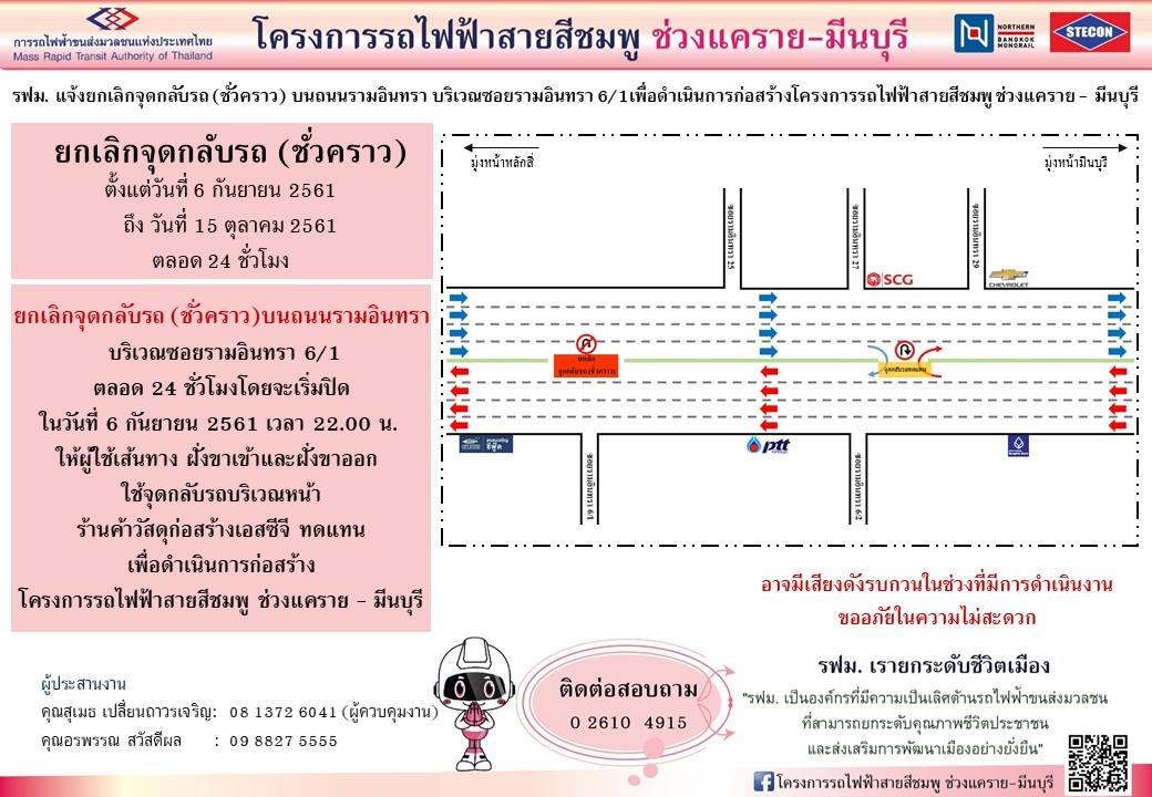 รฟม. แจ้งยกเลิกจุดกลับรถ (ชั่วคราว) บนถนนรามอินทรา บริเวณซอยรามอินทรา 6/1