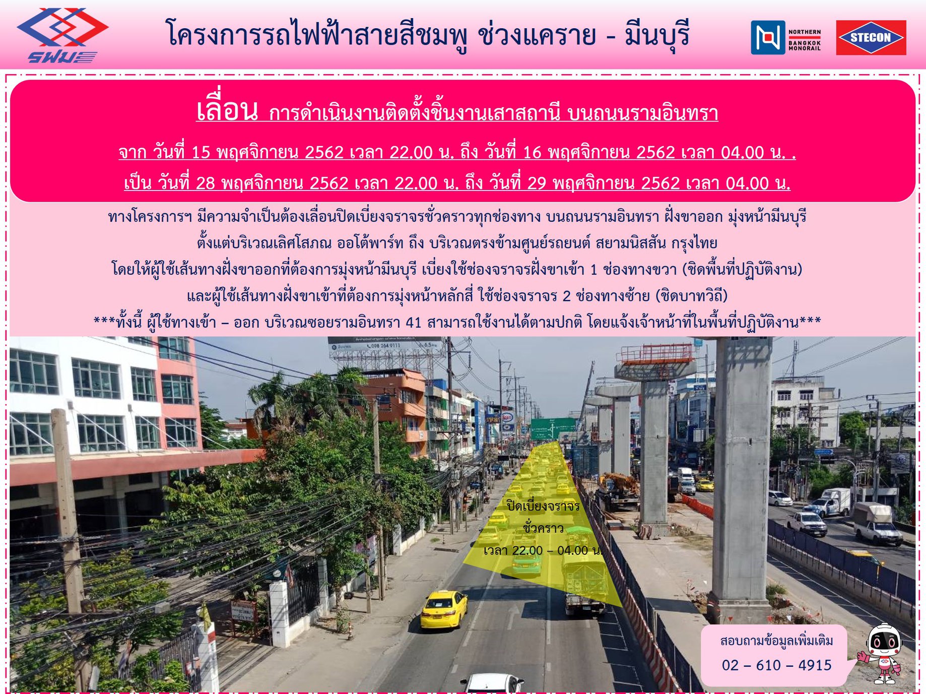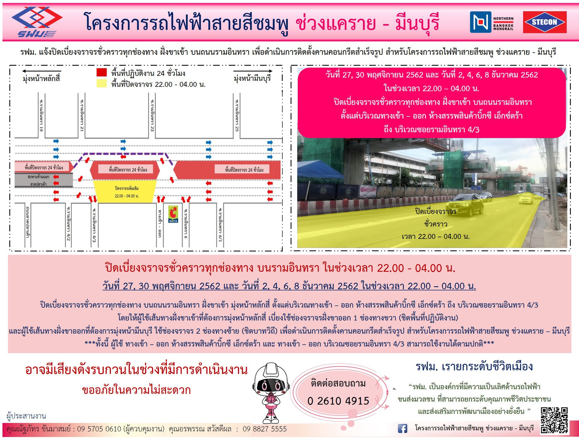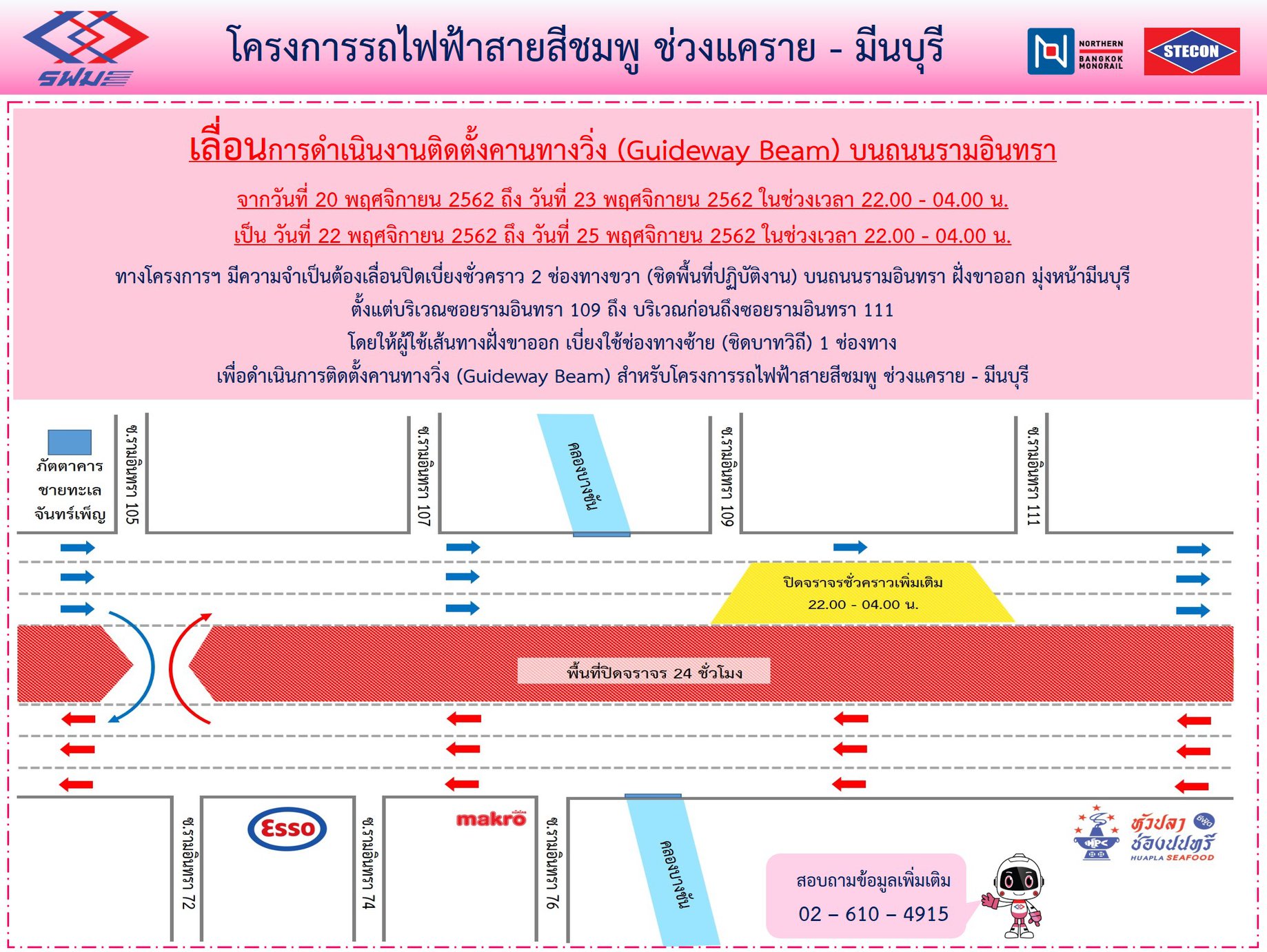 ปิดเบี่ยงจราจรชั่วคราวทุกช่องทาง บนถนนรามอินทรา ฝั่งขาเข้าและฝั่งขาออก เพื่อดำเนินการติดตั้งชิ้นงานเสาสถานี วันที่ 4 – 5 ธันวาคม 2562