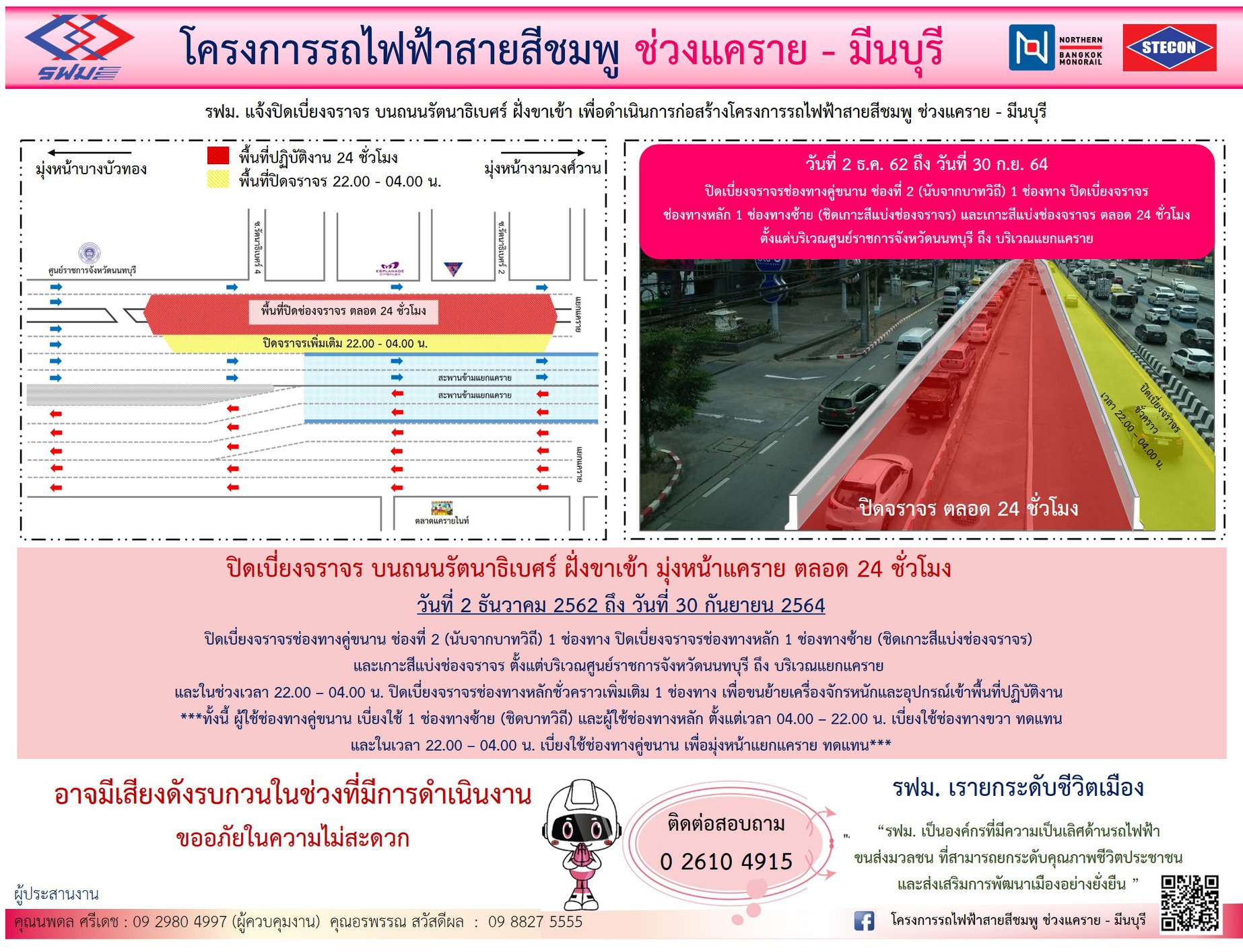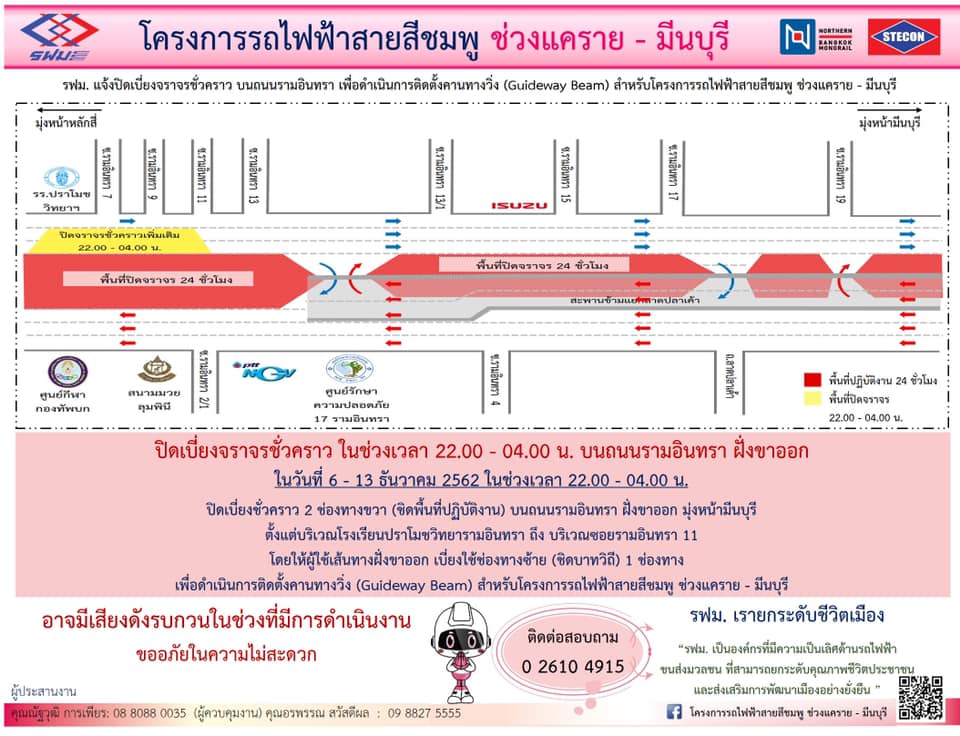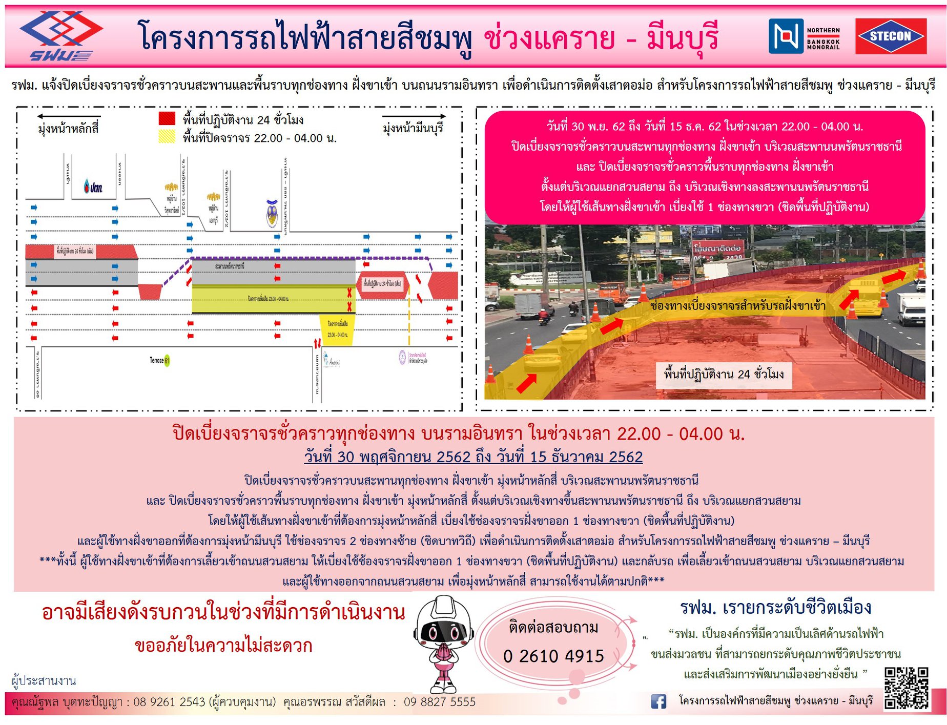 ปิดเบี่ยงจราจรชั่วคราวทุกช่องทาง บนถนนรามอินทรา ฝั่งขาเข้าและฝั่งขาออก เพื่อดำเนินการติดตั้งชิ้นงานเสาสถานี วันที่ 4 – 5 ธันวาคม 2562
