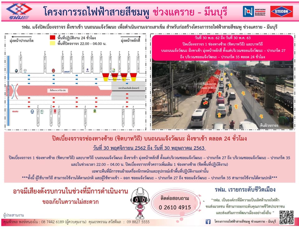 ปิดเบี่ยงจราจรและบาทวิถี บนถนนแจ้งวัฒนะ ฝั่งขาเข้า เพื่อดำเนินงานเจาะเสาเข็ม วันที่ 30 พฤศจิกายน 2562 ถึงวันที่ 30 พฤษภาคม 2563