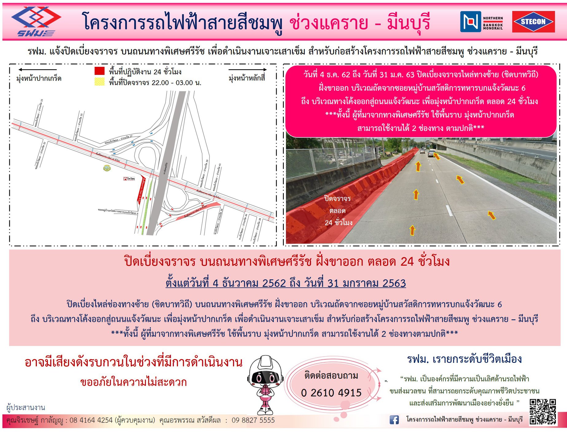 แจ้งปิดเบี่ยงจราจร บนถนนทางพิเศษศรีรัช ฝั่งขาออก เพื่อดำเนินงานเจาะเสาเข็ม วันที่ 4 ธันวาคม 2562 ถึงวันที่ 31 มกราคม 2563