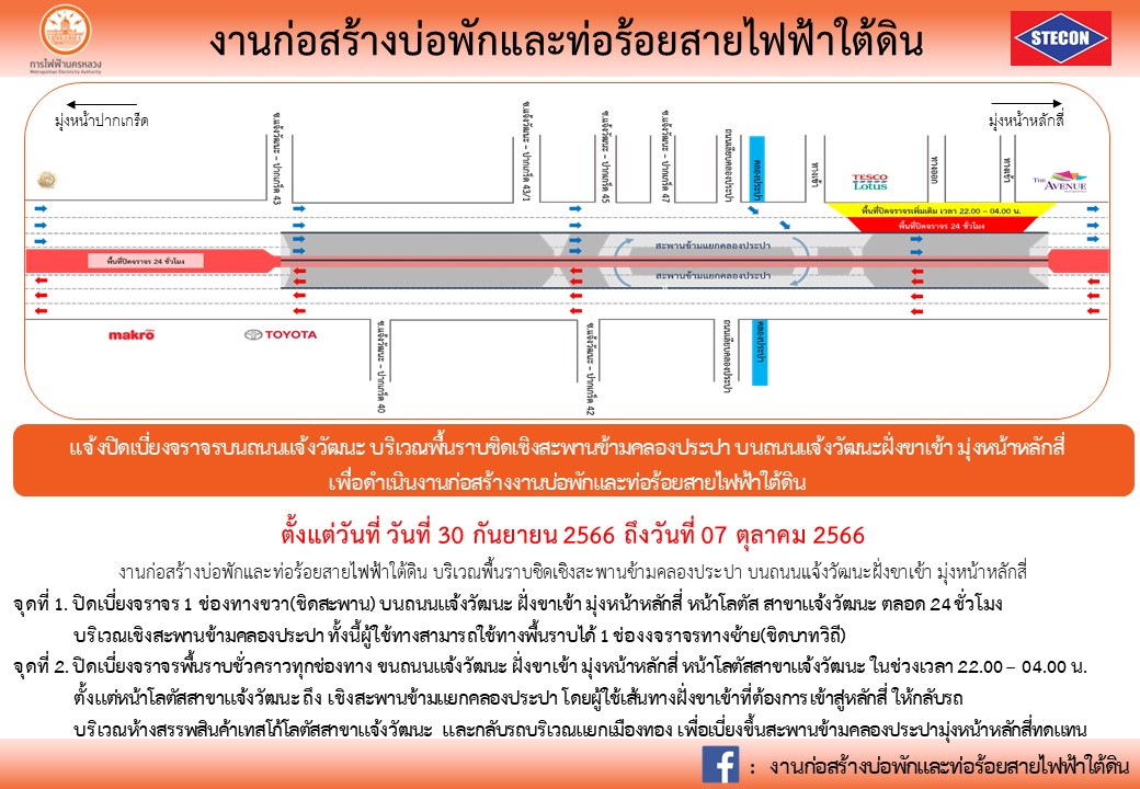 แจ้งปิดเบี่ยงจราจร 1 ช่องทางขวา (ชิดเกาะกลาง) บนถนนแจ้งวัฒนะ ฝั่งขาออก มุ่งหน้าปากเกร็ด ตั้งแต่ บริเวณหน้าบริษัท โทรคมนาคมแห่งชาติ จำกัด (มหาชน) ถึง หน้ากรมการกงสุล กระทรวงการต่างประเทศ ระยะทางประมาณ 350 เมตร ตั้งแต่ วันที่ 1 – 31 ตุลาคม 2566 เวลา 22.00 น. เป็นต้นไป ตลอด 24 ชั่วโมง
