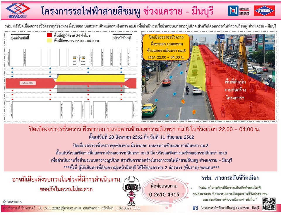 รฟม. แจ้งปิดเบี่ยงจราจรชั่วคราวทุกช่องทาง บนสะพานข้ามแยกรามอินทรา กม.8 เพื่อดำเนินงานรื้อย้ายระบบสาธารณูปโภค โครงการรถไฟฟ้าสายสีชมพู