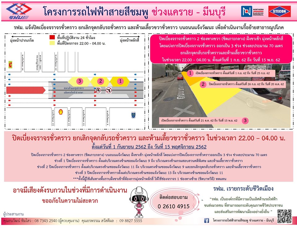 รฟม. แจ้งปิดเบี่ยงจราจรชั่วคราว ยกเลิกจุดกลับรถชั่วคราว และห้ามเลี้ยวขวาชั่วคราว บนถนนแจ้งวัฒนะ เพื่อดำเนินงานรื้อย้ายระบบสาธารณูปโภค สำหรับโครงการรถไฟฟ้าสายสีชมพู ช่วงแคราย