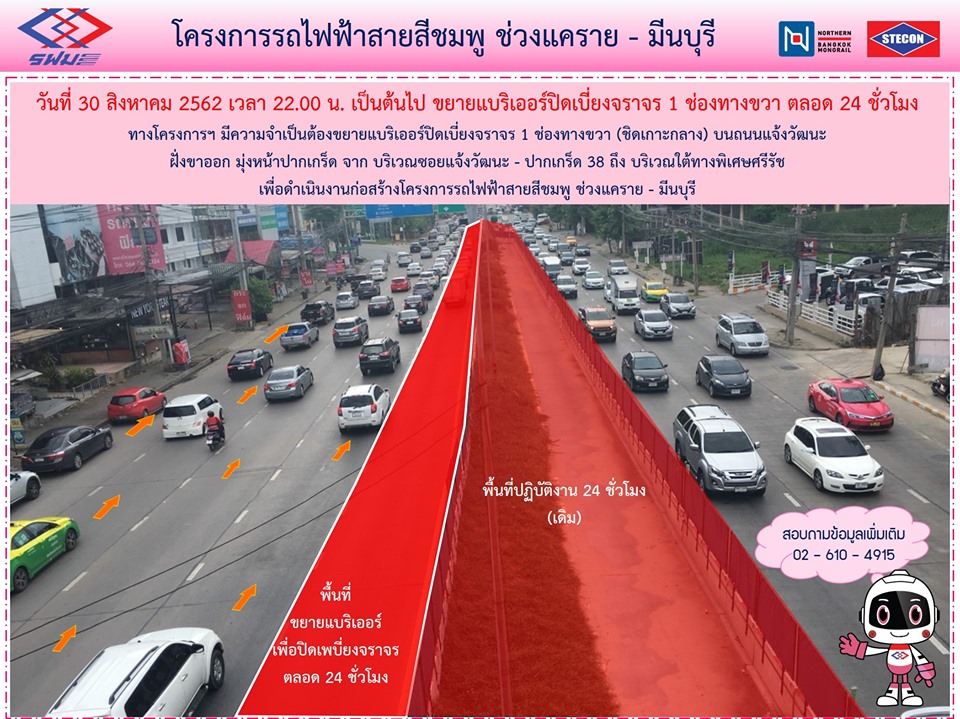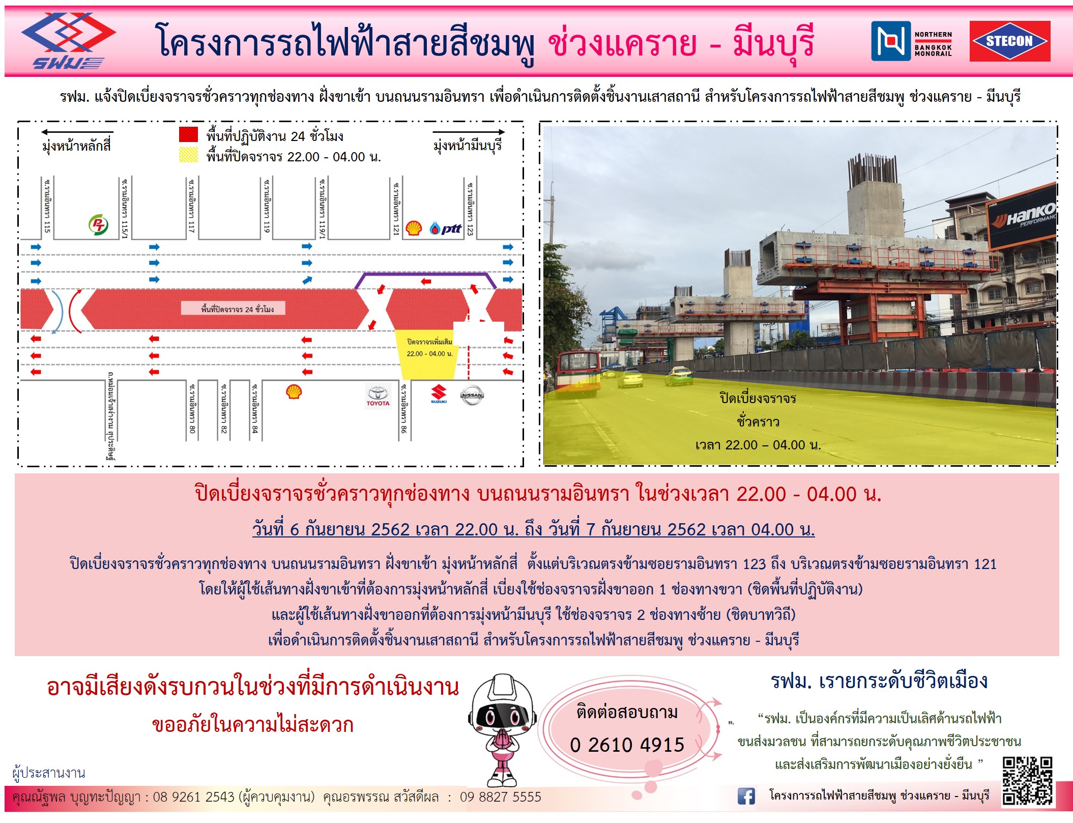 รฟม. แจ้งปิดเบี่ยงจราจรทุกช่องทางบนถนนรามอินทรา เพื่อดำเนินการติดตั้งชิ้นงานเสาสถานี สำหรับโครงการรถไฟฟ้าสายสีชมพู
