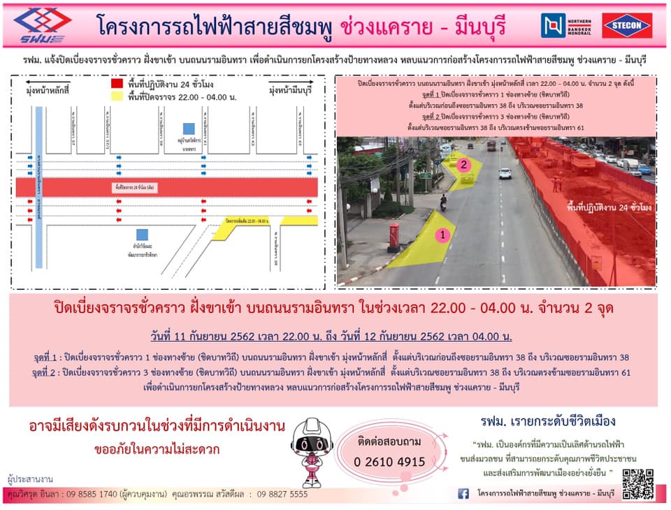 รฟม. แจ้งปิดเบี่ยงจราจรชั่วคราวทุกช่องทาง บนถนนรามอินทรา เพื่อดำเนินการติดตั้งชิ้นงานเสาสถานี สำหรับโครงการรถไฟฟ้าสายสีชมพู