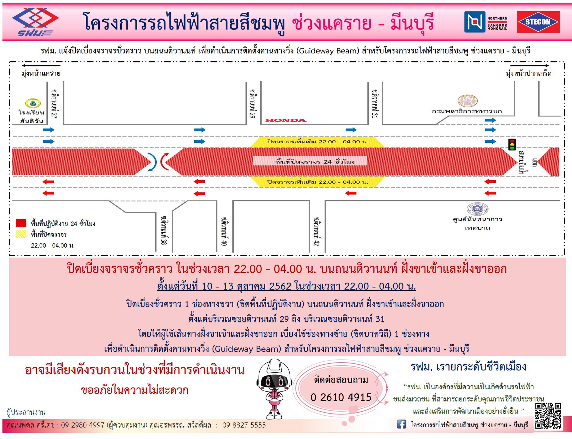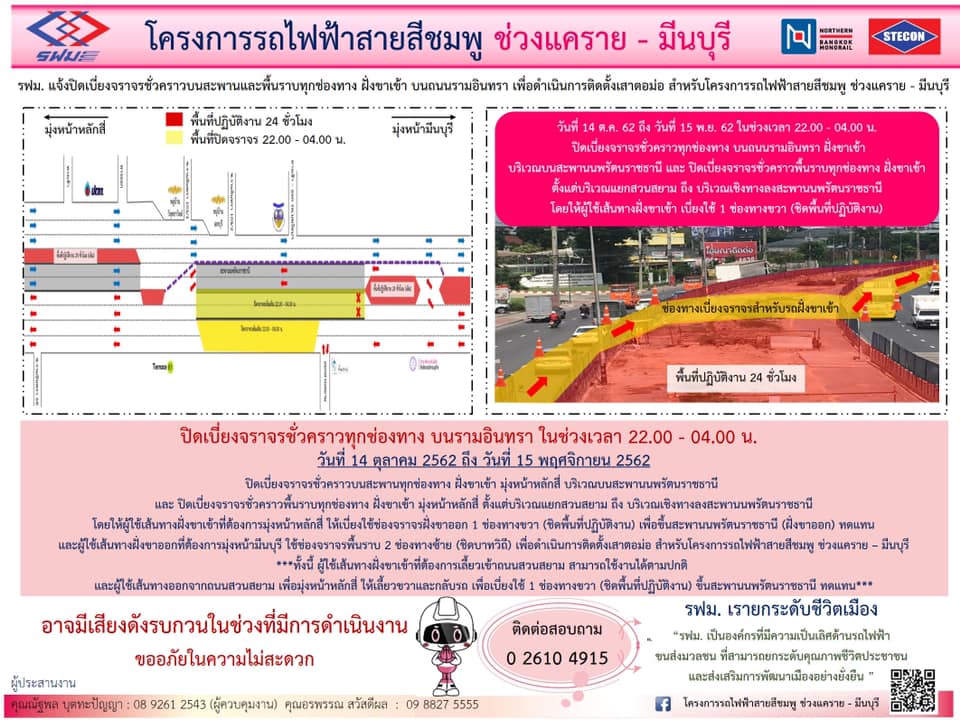 ปิดเบี่ยงจราจรชั่วคราวทุกช่องทาง บนถนนรามอินทรา ฝั่งขาเข้าและฝั่งขาออก เพื่อดำเนินการติดตั้งชิ้นงานเสาสถานี