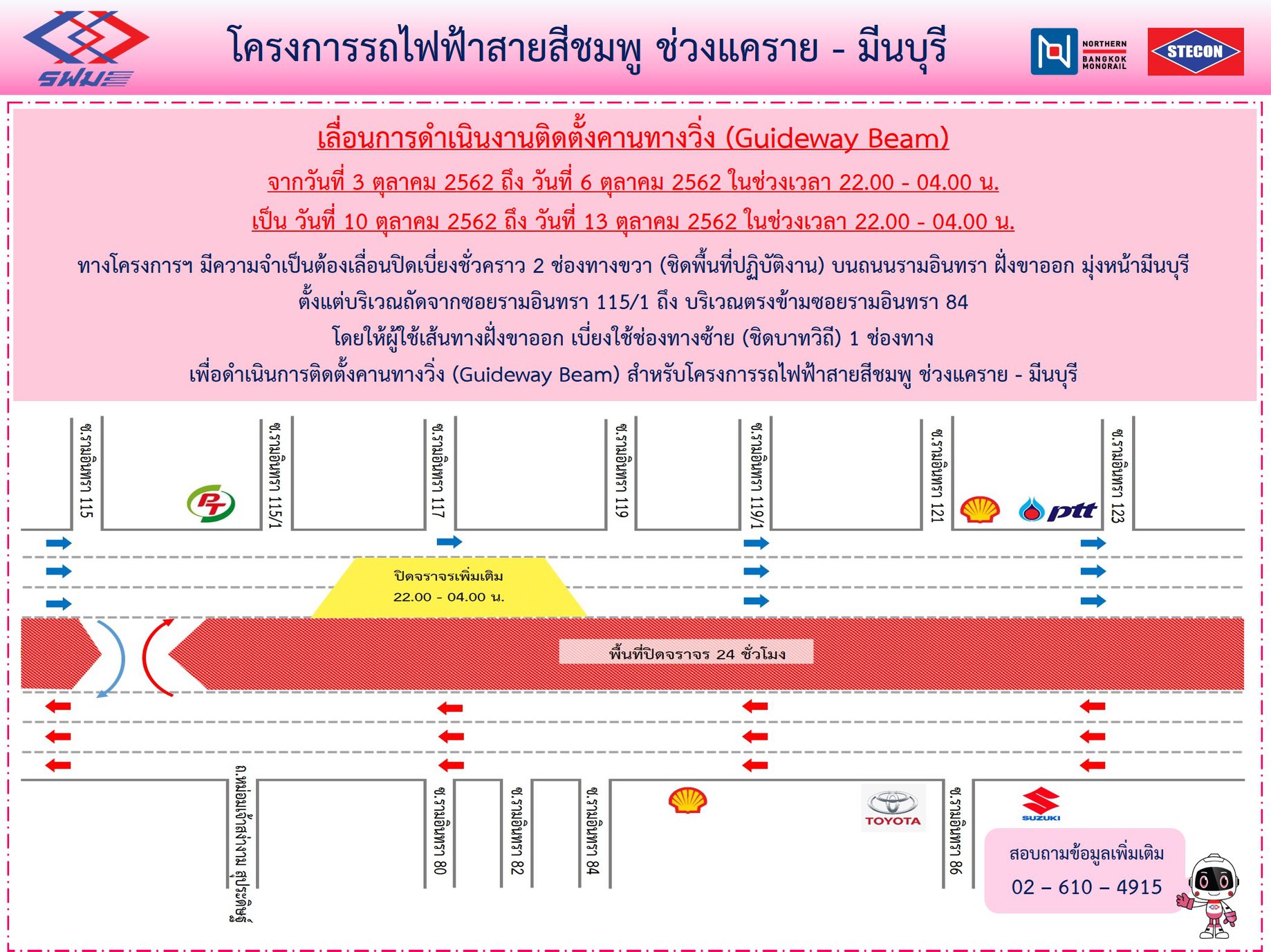 เลื่อนการดำเนินงานติดตั้งคานทางวิ่ง (Guideway Beam) บนถนนรามอินทรา ฝั่งขาออก มุ่งหน้ามีนบุรี