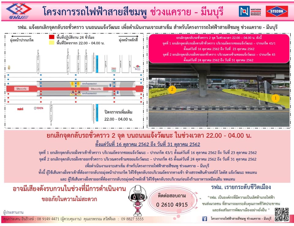 ยกเลิกจุดกลับรถชั่วคราว บนถนนแจ้งวัฒนะ ฝั่งขาเข้าและฝั่งขาออก เพื่อดำเนินงานเจาะเสาเข็ม