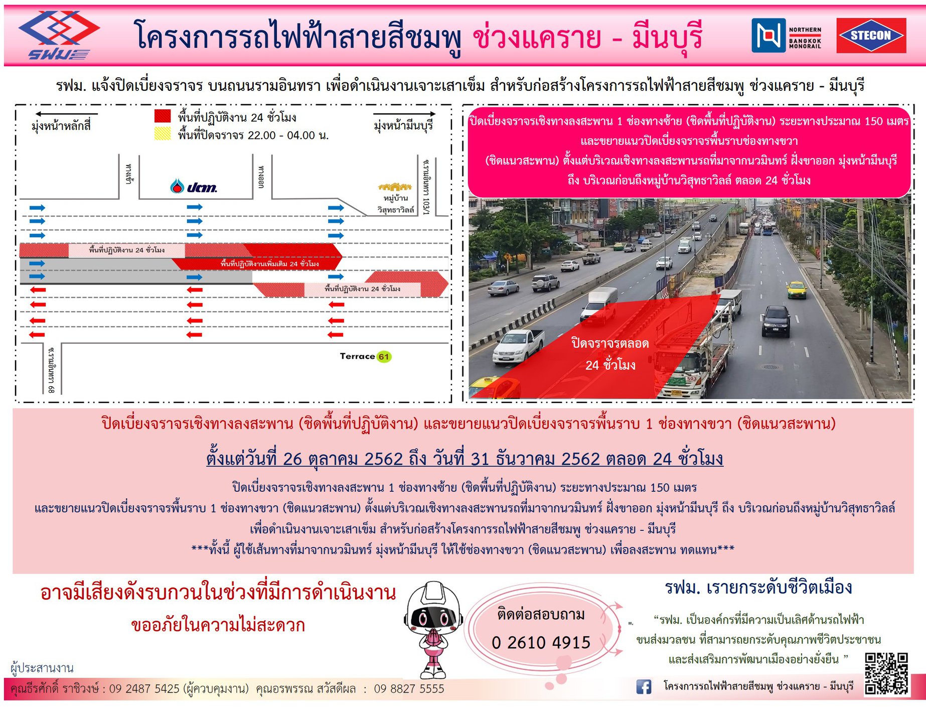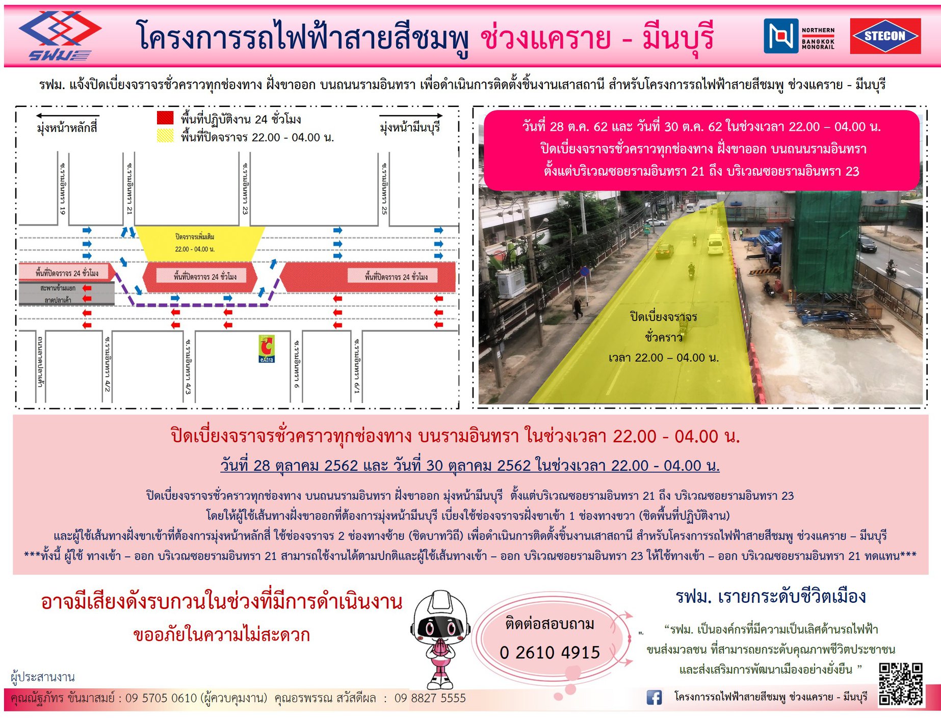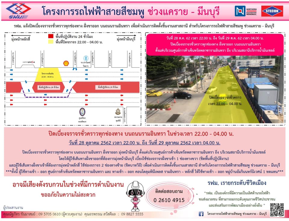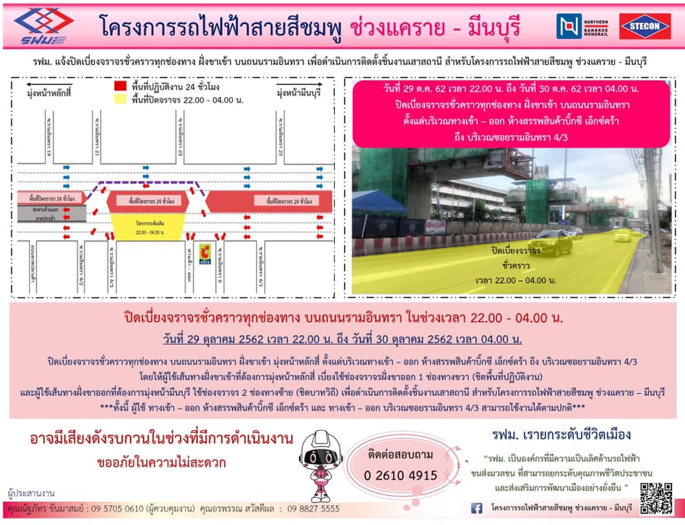 ปิดเบี่ยงจราจรชั่วคราวทุกช่องทาง บนถนนรามอินทรา ฝั่งขาเข้าและฝั่งขาออก เพื่อดำเนินการติดตั้งชิ้นงานเสาสถานี