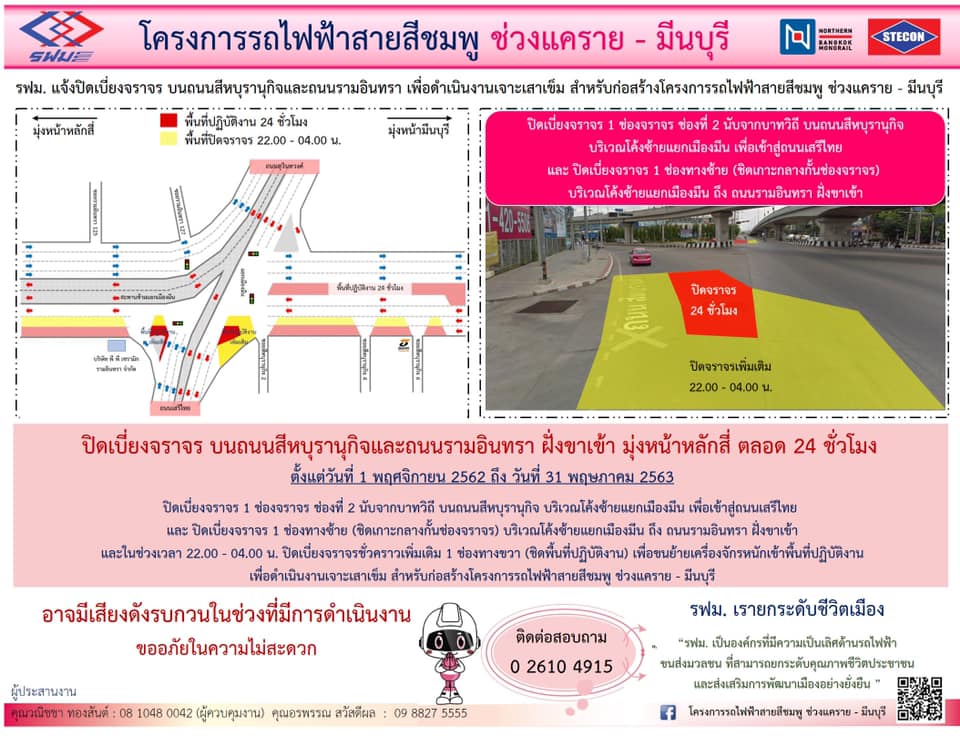 ปิดเบี่ยงจราจรชั่วคราวบนถนนรามอินทรา ฝั่งขาเข้า เพื่อดำเนินการติดตั้งเสาตอม่อ ตั้งแต่วันที่ 6 – 30 พฤศจิกายน 2562