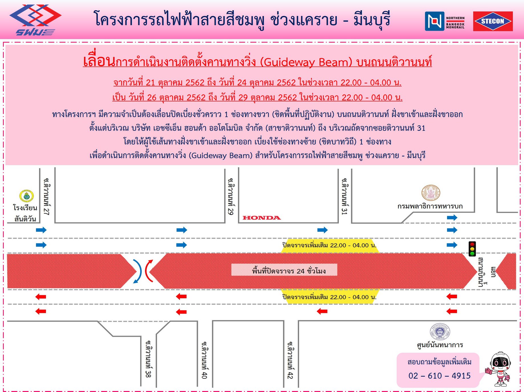 ปิดเบี่ยงจราจรชั่วคราว บนถนนติวานนท์ เพื่อดำเนินการติดตั้งคานทางวิ่ง (Guideway Beam) ตั้งแต่วันที่ 9 – 16 พฤศจิกายน 2562