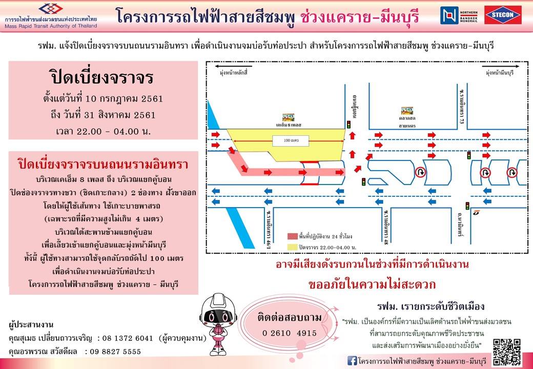 รฟม. แจ้งปิดเบี่ยงจราจรชั่วคราวบนถนนรามอินทรา ฝั่งขาออก บริเวณเคเอ็ม 8 เพลส ถึง แยกคู้บอน