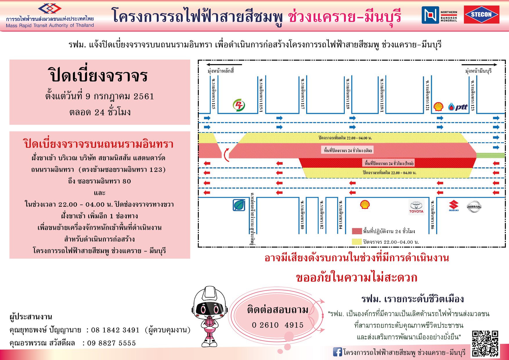 รฟม. แจ้งปิดเบี่ยงจราจรชั่วคราวบนถนนรามอินทรา ฝั่งขาออก บริเวณแยกคู้บอน ถึง บริเวณแยกนวมินทร์