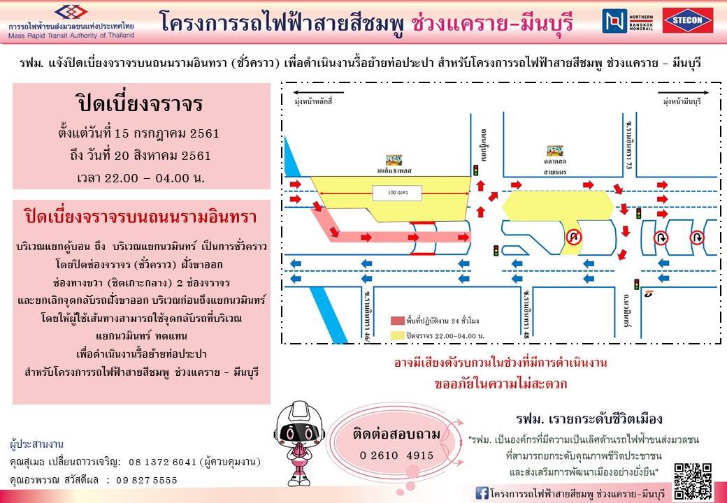 เบี่ยงจราจร 1 ช่องทางขวา (ชิดเกาะกลาง) ฝั่งขาเข้า ตลอด 24 ชั่วโมง บนถนนรามอินทรา บริเวณ บริษัท สยามนิสสัน แสตนดาร์ด จำกัด (ตรงข้ามซอยรามอินทรา 123) ถึง บริเวณซอยรามอินทรา 80