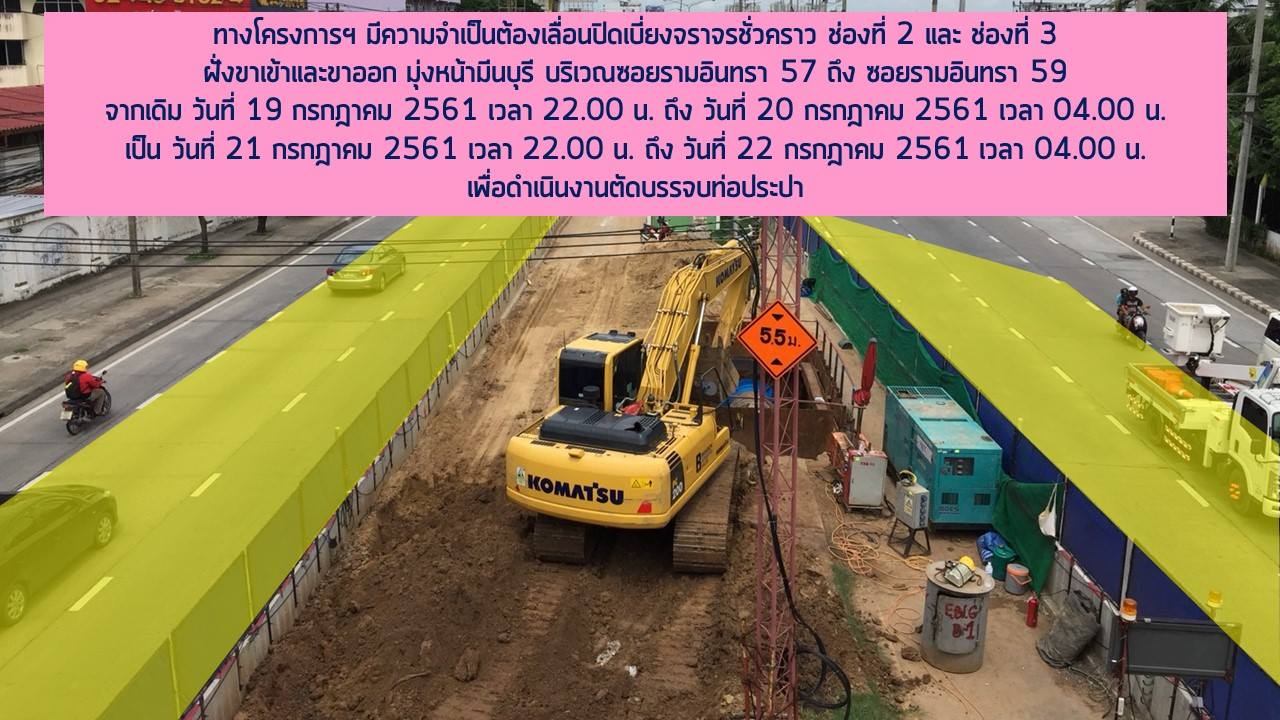 ปิดเบี่ยงจราจรชั่วคราว ช่องที่ 2 และ ช่องที่ 3 (นับจากเกาะกลาง) ฝั่งขาเข้าและขาออก บริเวณซอยรามอินทรา 57 และ ซอยรามอินทรา 59