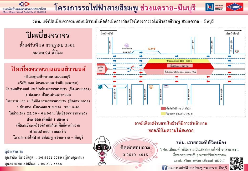 รฟม. แจ้งปิดเบี่ยงจราจรบนถนนติวานนท์ ฝั่งขาเข้าและขาออก บริเวณศูนย์โทรคมนาคมนนทบุรี บริษัท กสท โทรคมนาคม จำกัด (มหาชน) ถึง ซอยติวานนท์ 23