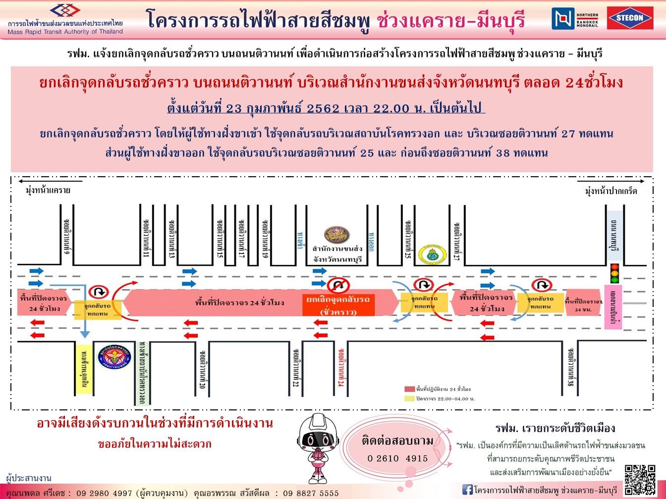 แจ้งยกเลิกจุดกลับรถชั่วคราว บริเวณสำนักงานขนส่งจังหวัดนนทบุรี ตั้งแต่วันที่ 23 กุมภาพันธ์ 2562 เวลา 22.00 น. เป็นต้นไป ตลอด 24 ชั่วโมง