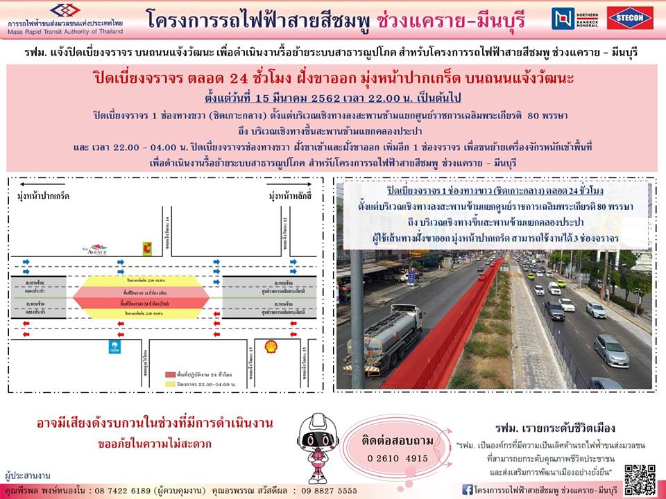 รฟม. แจ้งปิดเบี่ยงจราจรบนถนนแจ้งวัฒนะ ฝั่งขาออก บริเวณเชิงทางลงสะพานข้ามแยกศูนย์ราชการเฉลิมพระเกียรติ 80 พรรษา ถึง บริเวณเชิงทางขึ้นสะพานข้ามแยกคลองประปา เพื่อดำเนินงานรื้อย้ายระบบสาธารณูปโภค สำหรับโครงการรถไฟฟ้าสายสีชมพู ช่วงแคราย – มีนบุรี ตั้งแต่วันที่ 15 มีนาคม 2562 เวลา 22.00 น. เป็นต้นไป ตลอด 24 ชั่วโมง