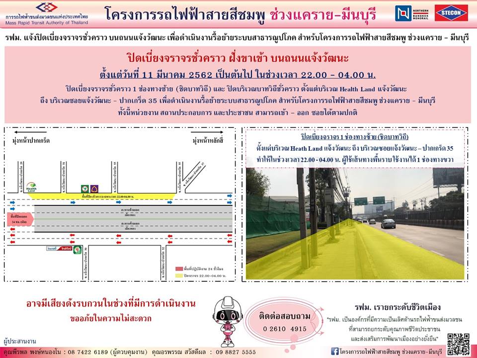 รฟม. แจ้งปิดเบี่ยงจราจรพื้นราบ ยกเลิกจุดกลับรถและห้ามเลี้ยวขวาชั่วคราว บนถนนแจ้งวัฒนะ ตั้งแต่บริเวณเชิงทางขึ้นสะพานข้ามแยกศูนย์ราชการเฉลิมพระเกียรติ ถึง บริเวณสถานีบริการน้ำมันเอสโซ่ เพื่อดำเนินงานรื้อย้ายระบบสาธารณูปโภค สำหรับโครงการรถไฟฟ้าสายสีชมพู ช่วงแคราย – มีนบุรี ตั้งแต่วันที่ 27 มีนาคม 2562 ถึง วันที่ 31 กรกฎาคม 2562 เวลา 22.00 – 04.00 น.