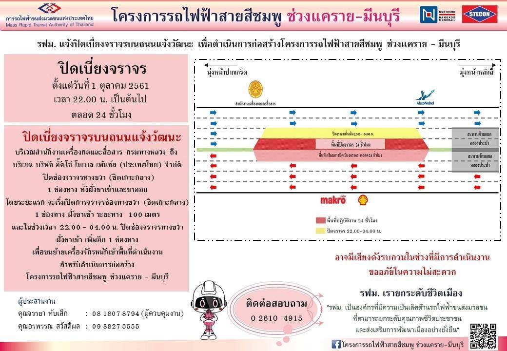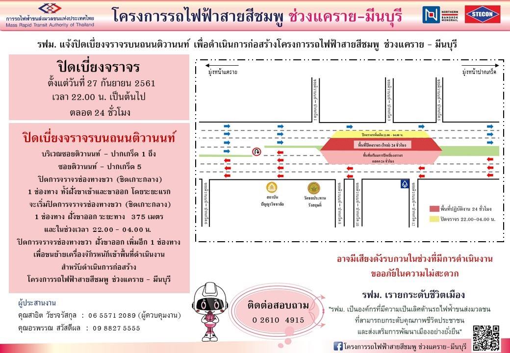 รฟม. แจ้งปิดช่องจราจรบนถนนแจ้งวัฒนะ ฝั่งขาออก บริเวณซอยแจ้งวัฒนะ – ปากเกร็ด 18 ถึง บริเวณ บริษัท ออด๊าซอินดัสทรี จำกัด และ บริเวณศูนย์บริการเชฟโรเล็ต ถึง บริเวณร้านพรีเมี่ยม เฟอร์นิเจอร์ เอาท์เล็ท