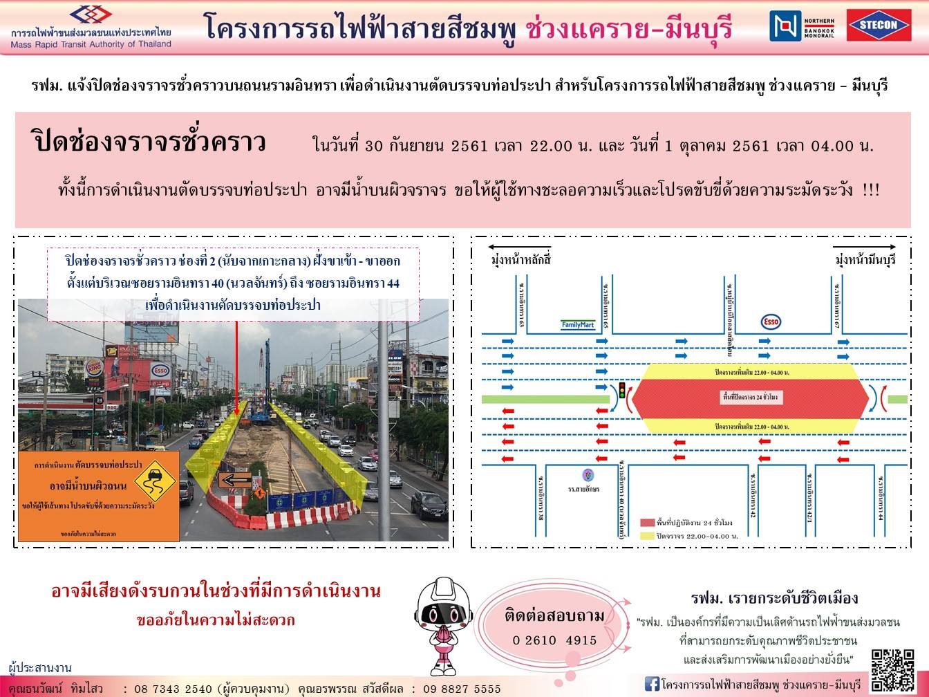 รฟม. แจ้งปิดช่องจราจรชั่วคราวบนถนนรามอินทราฝั่งขาเข้าและขาออก บริเวณซอยรามอินทรา 40 (นวลจันทร์) ถึง บริเวณซอยรามอินทรา 44 เพื่อดำเนินงานตัดบรรจบท่อประปา