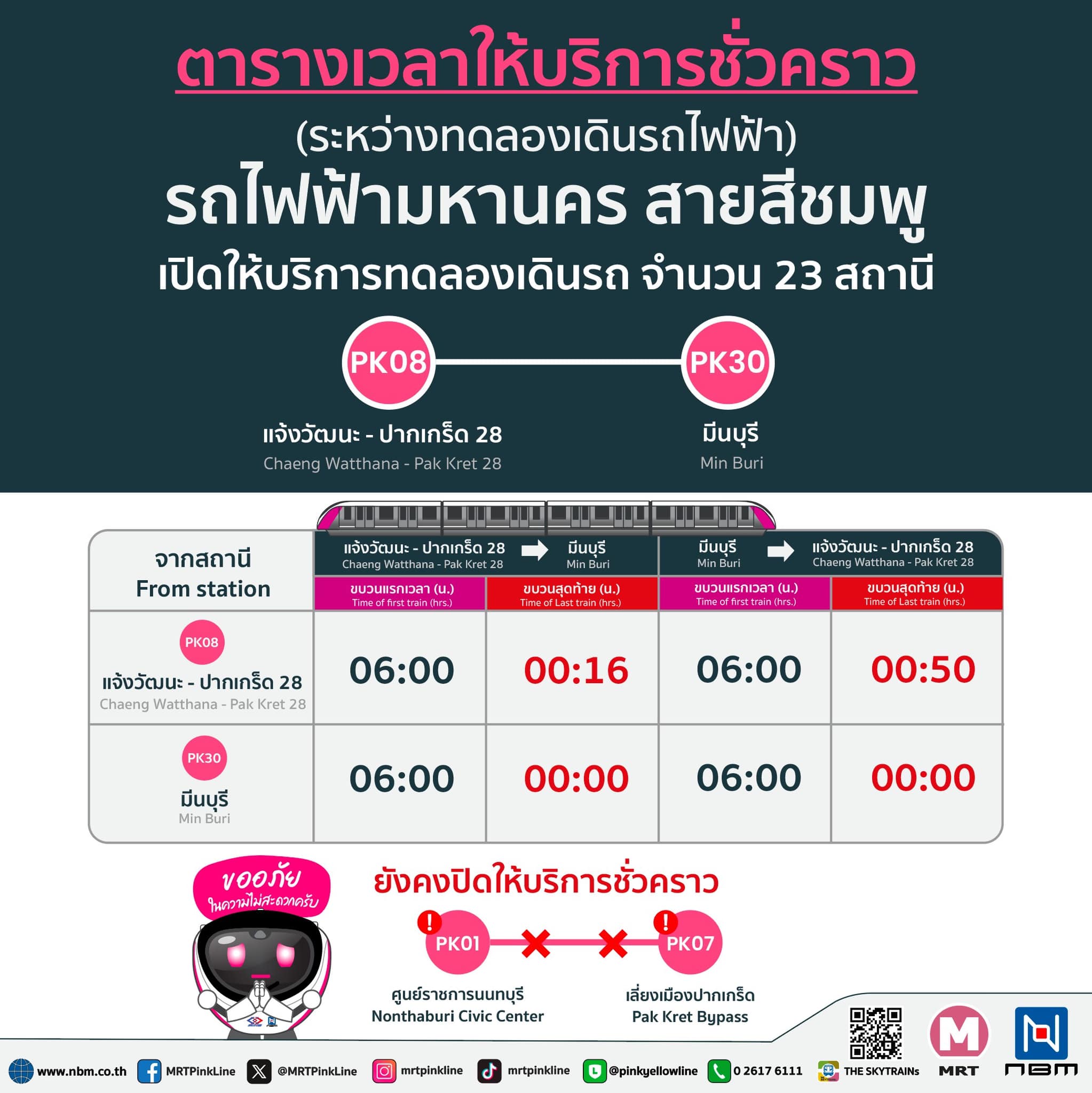 ตารางเวลาให้บริการชั่วคราว (ระหว่างทดลองเดินรถไฟฟ้า) รถไฟฟ้ามหานคร สายสีชมพู เปิดให้บริการทดลองเดินรถ จำนวน 23 สถานี