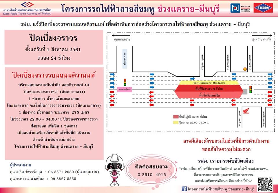 รฟม. แจ้งปิดเบี่ยงจราจรบนถนนติวานนท์ ฝั่งขาเข้าและขาออก บริเวณแยกสนามบินน้ำ ถึง บริเวณซอยติวานนท์ 44