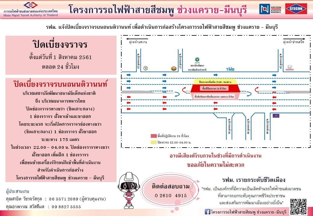 รฟม. แจ้งปิดเบี่ยงจราจรบนถนนติวานนท์ ฝั่งขาเข้าและขาออกบริเวณสถาบันพัฒนาอนามัยเด็กแห่งชาติ ถึง บริเวณธนาคารทหารไทย