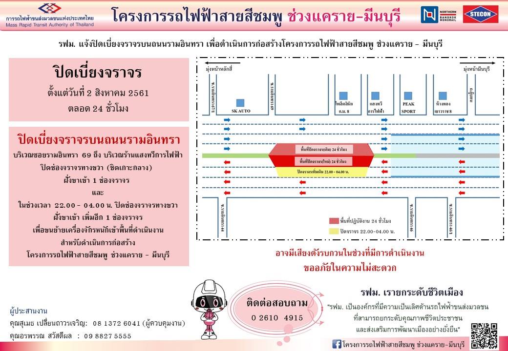 รฟม. แจ้งปิดเบี่ยงจราจรบนถนนรามอินทรา ฝั่งขาเข้าบริเวณซอยรามอินทรา 69 ถึง บริเวณร้านแสงทวีการไฟฟ้า
