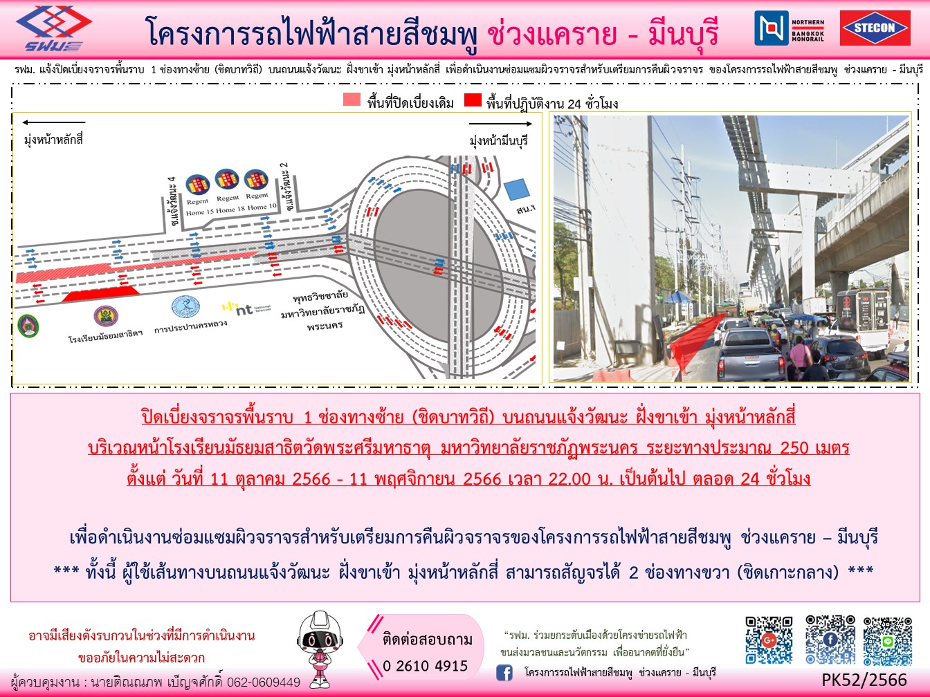 แจ้งปิดเบี่ยงจราจรพื้นราบ 1 ช่องทางซ้าย (ชิดบาทวิถี) บนถนนแจ้งวัฒนะ ฝั่งขาเข้า มุ่งหน้าหลักสี่ บริเวณหน้าโรงเรียนมัธยมสาธิตวัดพระศรีมหาธาตุ มหาวิทยาลัยราชภัฏพระนคร ระยะทางประมาณ 250 เมตรตั้งแต่ วันที่ 11 ตุลาคม 2566 – 11 พฤศจิกายน 2566 เวลา 22.00 น. เป็นต้นไป